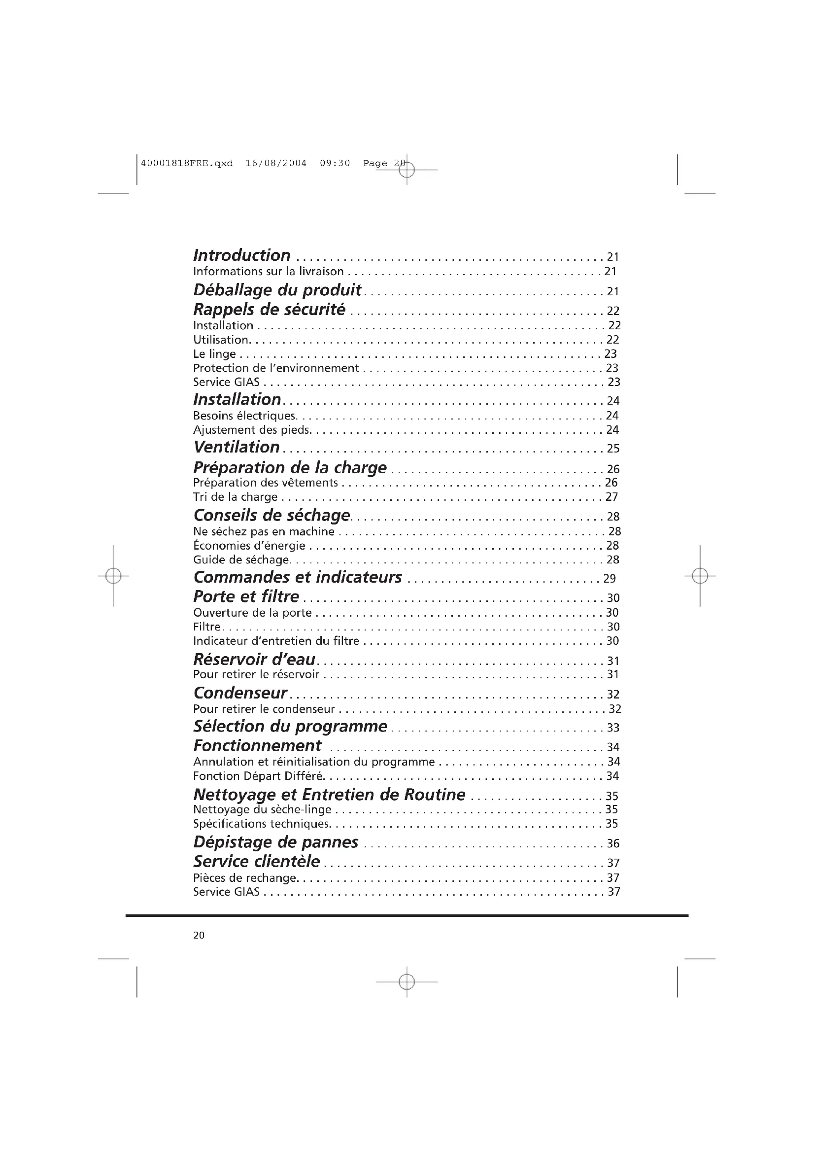 IMPORTANT Coupez toujours le courant et débranchez la fiche de l’alimentation électrique avant de nettoyer cet appareil. Pour les données électriques, veuillez consulter l’étiquette des valeurs nominales qui se trouve à l’avant de l’armoire du sèche-linge (avec la porte ouverte). Nettoyage et Entretien de Routine ATTENTION ! Il est possible que le tambour, la porte et la charge soient très chauds. 40001818FRE.qxd 16/08/2004 09:30 Page 35Qu’est-ce qui peut être à l’origine de... Défauts que vous pouvez rectifier vous-même Avant d’appeler le service GIAS pour obtenir des conseils, veuillez suivre la liste des vérifications ci-dessous. L’intervention sera facturée si la machine fonctionne correctement ou si elle a été installée ou utilisée de manière incorrecte. Si le problème persiste alors que vous avez terminé les vérifications recommandées, veuillez appeler le service GIAS qui pourra peut-être vous aider par téléphone. La période de séchage est trop longue/les vêtements ne sont pas suffisamment secs… ● Avez-vous sélectionné le temps de séchage/le programme qui convient ? ● Les vêtements étaient-ils trop mouillés ? Les vêtements avaient-ils été adéquatement essorés en machine ou à la main ? ● Le filtre doit-il être nettoyé ? ● Faut-il nettoyer le condenseur ? ● Le sèche-linge est-il surchargé ? ● Les entrées, sorties et la base du sèche-linge sont-elles libres d’obstructions ? ● Avez-vous sélectionné le bouton Séchage Délicat au cours d’un cycle précédent ? Le sèche-linge ne fonctionne pas… ● Le sèche-linge est-il branché sur une alimentation électrique adéquate ? Vérifiez à l’aide d’un autre appareil, par exemple une lampe de chevet. ● La fiche est-elle bien branchée sur l’alimentation de secteur ? ● Y a-t-il une panne de courant ? ● Le fusible a-t-il sauté ? ● La porte est-elle bien fermée ? ● Le sèche-linge est-il en position de marche, au niveau du courant de secteur et de la machine ? ● La période de séchage ou le programme a-t-il été sélectionné ? ● La machine a-t-elle été remise en marche après l’ouverture de la porte ? ● Le sèche-linge s’est-il arrêté parce que le réservoir d’eau est plein et qu’il faut le vider ? Le sèche-linge est bruyant… ● Arrêtez le sèche-linge et contactez le service GIAS pour obtenir des conseils. L’indicateur d’entretien du filtre est allumé. ● Le filtre doit-il être nettoyé ? ● Faut-il nettoyer le condenseur ? Indicateur Vider Eau est en marche… ● Le réservoir d’eau doit-il être vidé ?