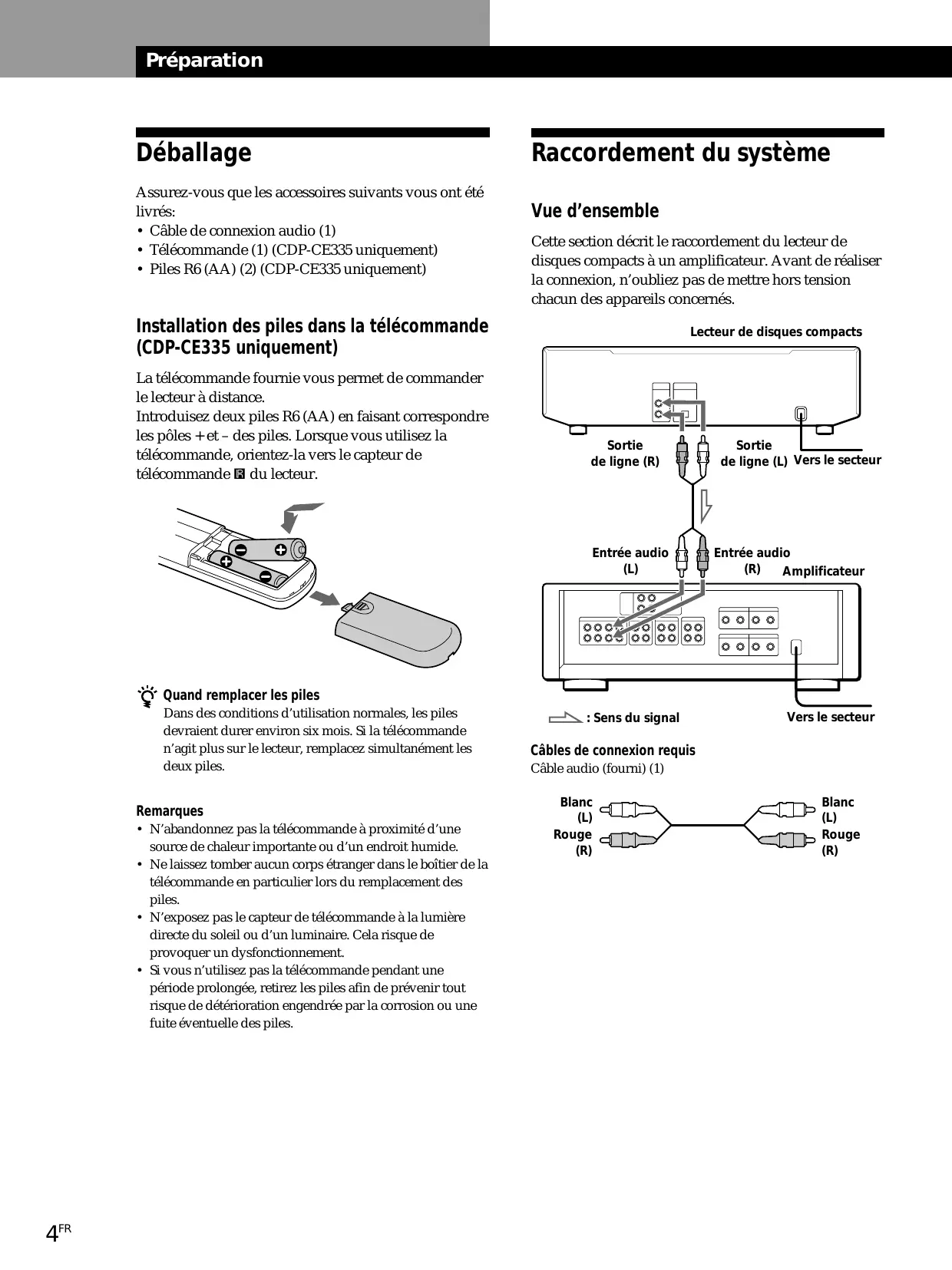 Assurez-vous que les accessoires suivants vous ont été livrés: • Câble de connexion audio (1) • Télécommande (1) (CDP-CE335 uniquement) • Piles R6 (AA) (2) (CDP-CE335 uniquement)