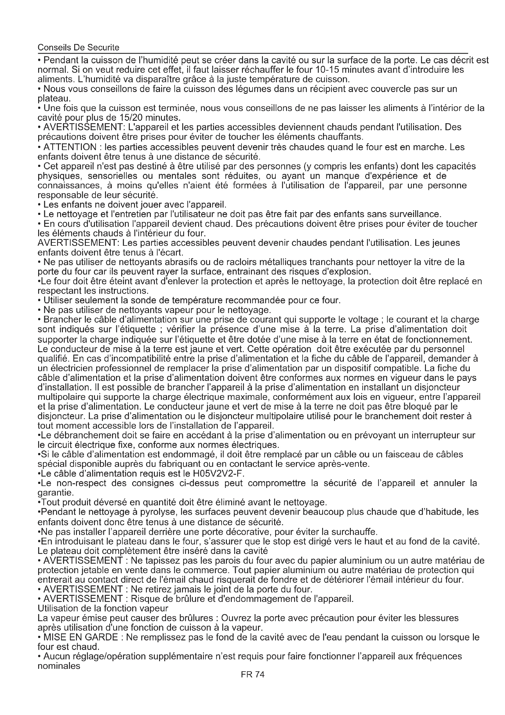 - Aucun réglage/opération supplémentaire n’est requis pour faire fonctionner l’appareil aux fréquences nominales Conseils De Securite FR 74Sommaire FR 75 Nettoyage du four et maintenance Instructions Générales