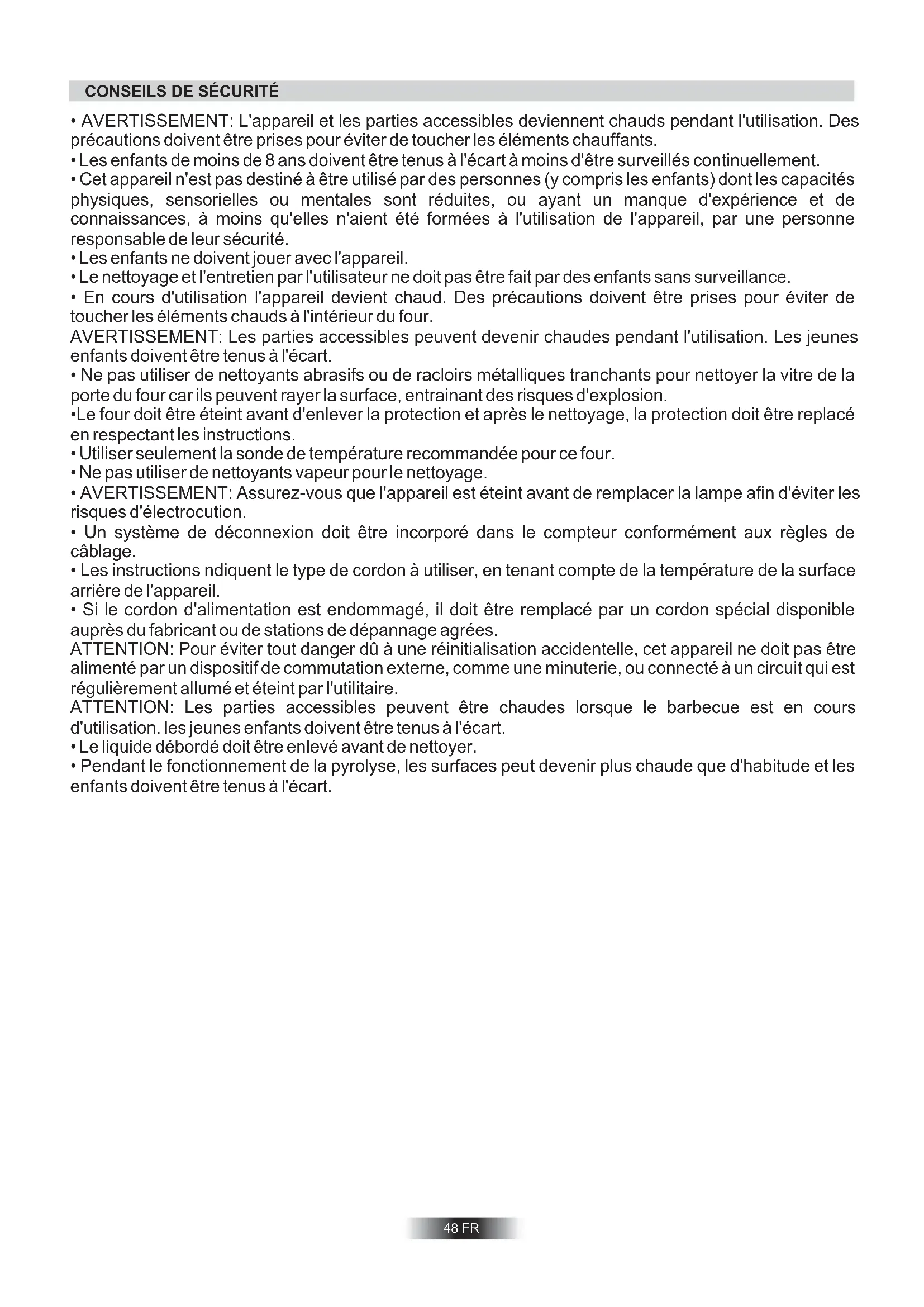 48 FR49 FR INSTRUCTIONS GENERALES — Lire attentivement les instructions contenues dans cette brochure, elles fournissent d’importantes indications sur la sécurité d’installation, l’emploi du four et son entretien. — Conserver soigneusement cette notice d’utilisation pour toutes consultations ultérieures. — Après avoir déballé votre four, vérifier que l’appareil est complet. — Les emballages comme le plastique, le polystyrène, peuvent constituer un danger pour les enfants. Ne pas les laisser à leur portée. ATTENTION Lors de la première utilisation du four, il peut se produire un dégagement de fumée âcre provoqué par le premier échauffement du collant des panneaux d’isolation enveloppant le four. Ce phénomène est normal. Attendez que la fumée cesse avant de cuire des aliments. ATTENTION: La tension et la fréquence d’alimentation sont indiquées sur la plaque signalétique (illustration dernière page). Faites appel à un professionnel pour l’installation de votre four.