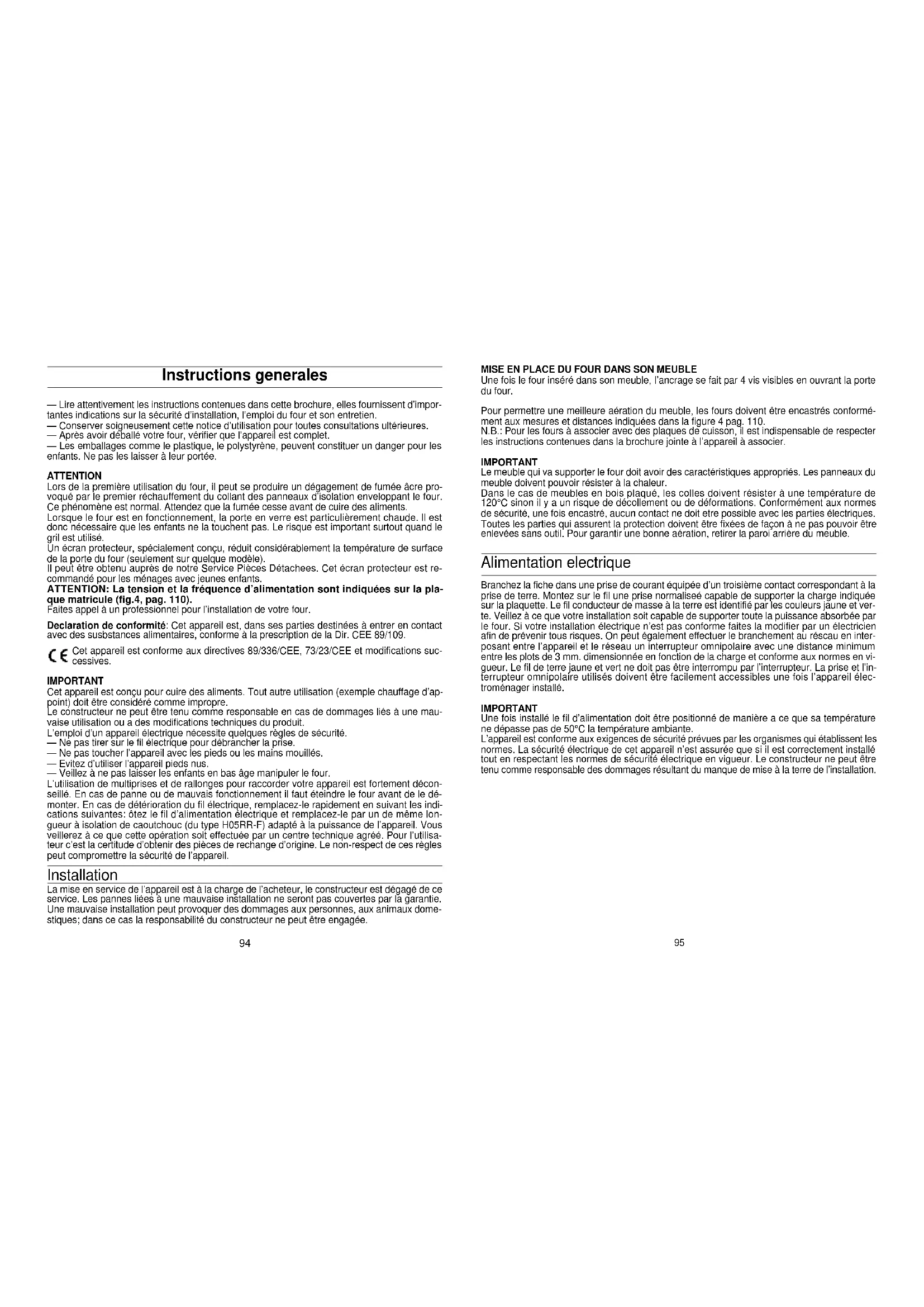 Instructions generales — Lire attentivement les instructions contenues dans cette brochure, elles fournissent d’impor- tantes indications sur la sécurité d’installation, l’emploi du four et son entretien. — Conserver soigneusement cette notice d’utilisation pour toutes consultations ultérieures. — Après avoir déballé votre four, vérifier que l’appareil est complet. — Les emballages comme le plastique, le polystyrène, peuvent constituer un danger pour les enfants. Ne pas les laisser à leur portée. ATTENTION Lors de la première utilisation du four, il peut se produire un dégagement de fumée âcre pro- voqué par le premier réchauffement du collant des panneaux d’isolation enveloppant le four. Ce phénomène est normal. Attendez que la fumée cesse avant de cuire des aliments. Lorsque le four est en fonctionnement, la porte en verre est particulièrement chaude. ll est donc nécessaire que les enfants ne la touchent pas. Le risque est important surtout quand le gril est utilisé. Un écran protecteur, spécialement conçu, réduit considérablement la température de surface de la porte du four (seulement sur quelque modèle). Il peut être obtenu auprès de notre Service Pièces Détachees. Cet écran protecteur est re- commandé pour les ménages avec jeunes enfants. ATTENTION: La tension et la fréquence d’alimentation sont indiquées sur la pla- que matricule (fig.4, pag. 110). Faites appel à un professionnel pour l’installation de votre four. Declaration de conformité: Cet appareil est, dans ses parties destinées à entrer en contact avec des susbstances alimentaires, conforme à la prescription de la Dir. CEE 89/109. Cet appareil est conforme aux directives 89/336/CEE, 73/23/CEE et modifications suc- cessives. IMPORTANT Cet appareil est conçu pour cuire des aliments. Tout autre utilisation (exemple chauffage d’ap- point) doit être considéré comme impropre. Le constructeur ne peut être tenu comme responsable en cas de dommages liés à une mau- vaise utilisation ou a des modifications techniques du produit. L’emploi d’un appareil électrique nécessite quelques règles de sécurité. — Ne pas tirer sur le fil électrique pour débrancher la prise. — Ne pas toucher l’appareil avec les pieds ou les mains mouillés. — Evitez d’utiliser l’appareil pieds nus. — Veillez à ne pas laisser les enfants en bas âge manipuler le four. L’utilisation de multiprises et de rallonges pour raccorder votre appareil est fortement décon- seillé. En cas de panne ou de mauvais fonctionnement il faut éteindre le four avant de le dé- monter. En cas de détérioration du fil électrique, remplacez-le rapidement en suivant les indi- cations suivantes: ôtez le fil d’alimentation électrique et remplacez-le par un de même lon- gueur à isolation de caoutchouc (du type H05RR-F) adapté à la puissance de l’appareil. Vous veillerez à ce que cette opération soit effectuée par un centre technique agréé. Pour l’utilisa- teur c’est la certitude d’obtenir des pièces de rechange d’origine. Le non-respect de ces règles peut compromettre la sécurité de l’appareil. Installation La mise en service de l’appareil est à la charge de l’acheteur, le constructeur est dégagé de ce service. Les pannes liées à une mauvaise installation ne seront pas couvertes par la garantie. Une mauvaise installation peut provoquer des dommages aux personnes, aux animaux dome- stiques; dans ce cas la responsabilité du constructeur ne peut être engagée. 94Grill traditionnel (l’utilisation du grill se fait porte fermée) Utilisation de la résistance du grill à rayons infrarouges.Excellente dans la cuisson de viandes de petites et moyennesépaisseurs (grillades, brochettes) ou pour le gratinage. Grill ventilé (l’utilisation du grill se fait porte fermée) L’air est chauffé par la résistance du gril entre 50 et 200°C. Le ventila-teur créé des flux d’air autour des aliments pour mieux griller et grati- ner. Four ventilé:Utilisation simultanée de la résistance de sole, de voute et de laturbine qui brasse l’air dans l’enceinte du four. Cette fonctionest recommandée pour la cuisson de la volaille, poisson, patis-serie, etc... Ce mode de cuisson assure une bonne repartitionde la chaleur.Convection naturelleMise en fonctionnement des deux résistances.La convection naturelle est utilisée pour cuire des viandes rouges, tartessalées.Une fois le bouton tourné sur cette position, la lampe reste allumée pen-dant toutes les opérations.Le four est doté de:• une résistance de sole;• una résistance de voûte pour chauffer et griller FOUR MULTIFONCTIONS AVEC MINUTEUR COUPE CIRCUIT OU MINUTEUR SONORE Minuteur coupe circuit ouminuteur sonorePour le fonctionnement du minuteursonore ou du minuteur coupe circuitvoir paragraphe pag. 101.