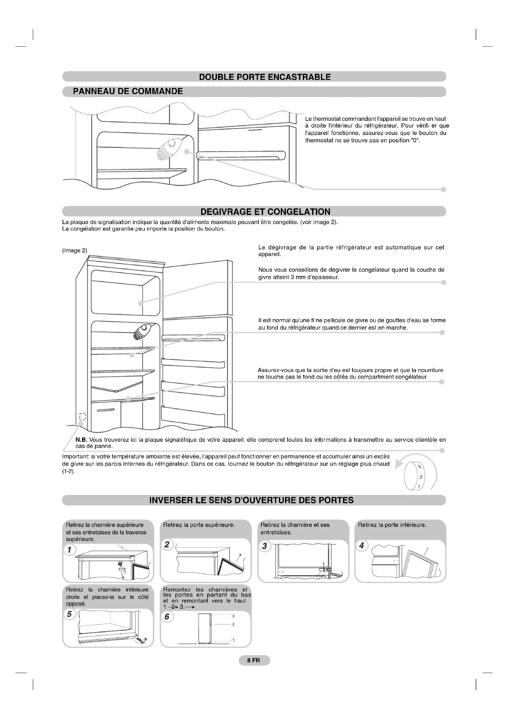 La plaque de signalisation indique la quantité d'aliments maximale pouvant être congelée. (voir image 2). La congélation est garantie peu importe la position du bouton. Le dégivrage de la partie réfrigérateur est automatique sur cet appareil. Nous vous conseillons de dégivrer le congélateur quand la couche de givre atteint 3 mm d'épaisseur. Il est normal qu'une fi ne pellicule de givre ou de gouttes d'eau se forme au fond du réfrigérateur quand ce dernier est en marche. Assurez-vous que la sortie d'eu est toujours propre et que la nourriture ne touche pas le fond ou les côtés du compartiment congélateur. Important: si votre température ambiante est élevée, l'appareil peut fonctionner en permanence et accumuler ainsi un excès de givre sur les parois internes du réfrigérateur. Dans ce cas, tournez le bouton du réfrigérateur sur un réglage plus chaud (1-2). (Image 2) N.B. Vous trouverez ici la plaque signalétique de votre appareil: elle comprend toutes les informations à transmettre au service clientèle en cas de panne. Retirez la charnière supérieure et ses entretoises de la traverse supérieure. Retirez la charnière inférieure droite et placez-la sur le côté opposé. Retirez la porte supérieure. Remontez les charnières et les portes en partant du bas et en remontant vers le haut