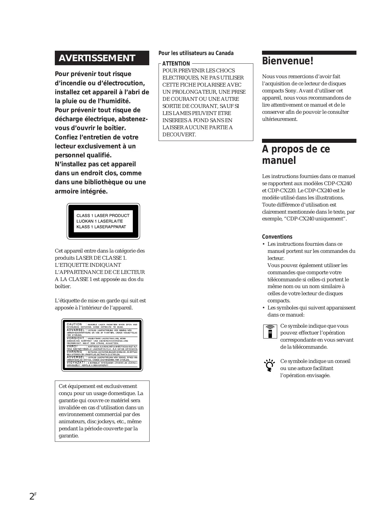 Nous vous remercions d’avoir fait l’acquisition de ce lecteur de disques compacts Sony. Avant d’utiliser cet appareil, nous vous recommandons de lire attentivement ce manuel et de le conserver afin de pouvoir le consulter ultérieurement.