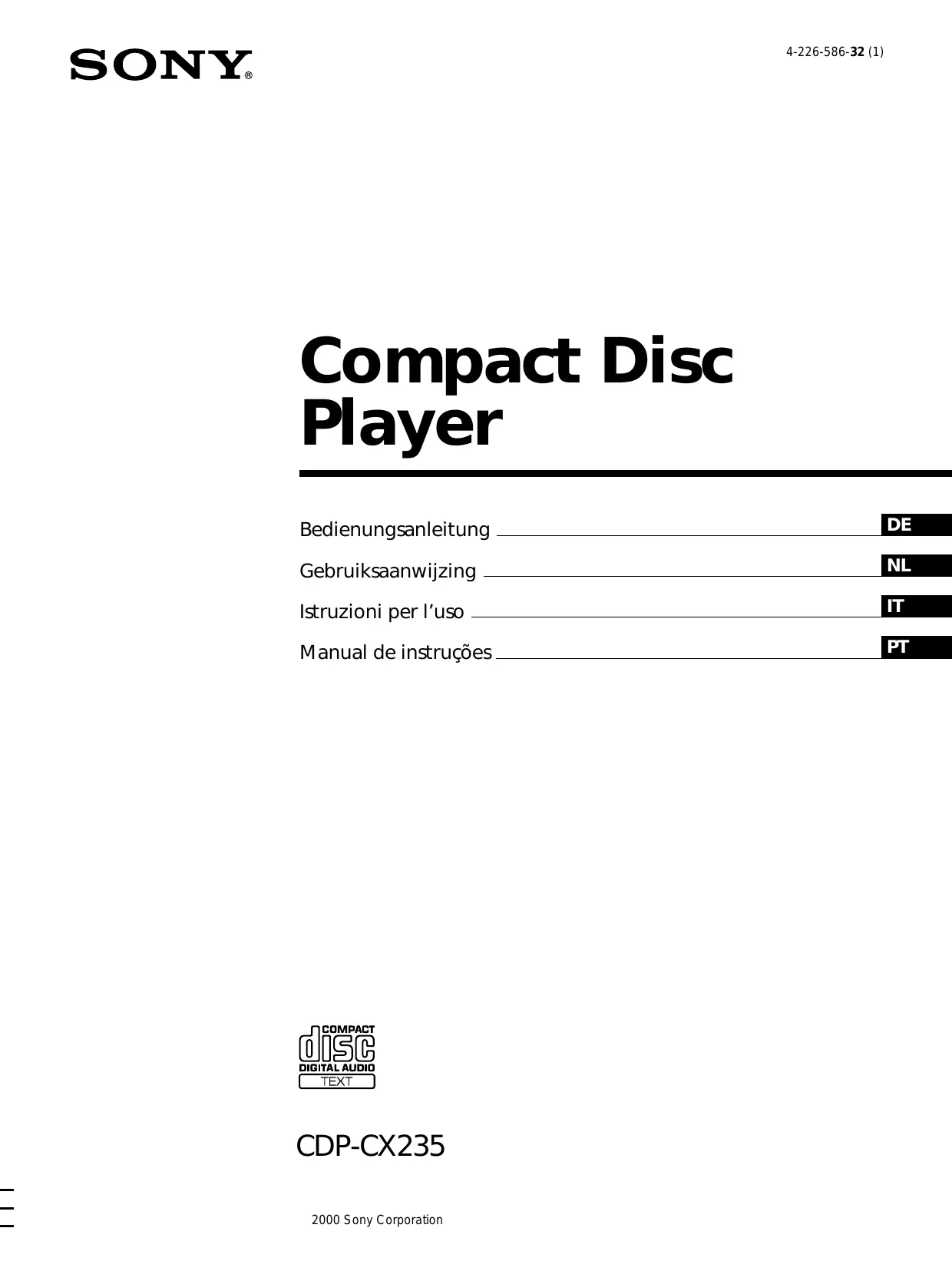 Téléchargez la notice de votre Lecteur CD au format PDF gratuitement ! Retrouvez votre notice CDP-CX235 - SONY et reprennez votre appareil électronique en main. Sur cette page sont publiés tous les documents nécessaires à l'utilisation de votre appareil CDP-CX235 de la marque SONY.