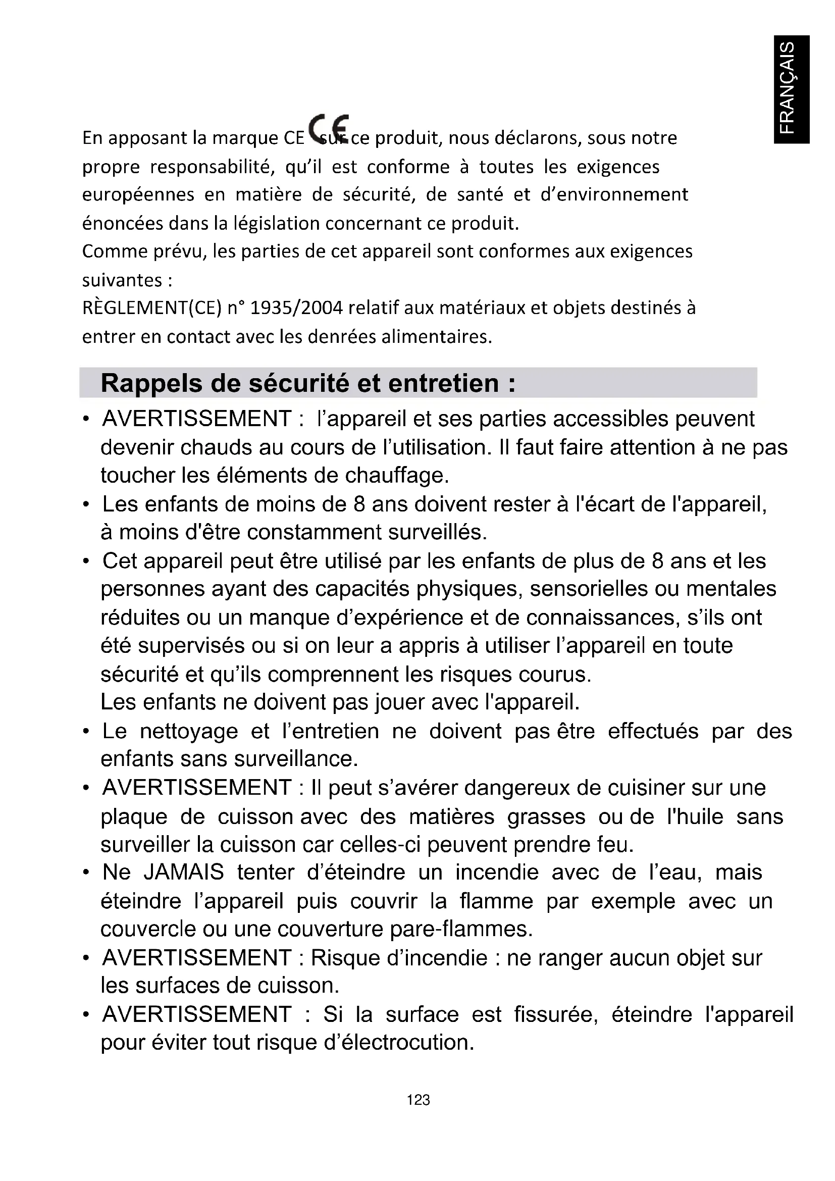 En apposant la marque CE sur ce produit, nous déclarons, sous notre propre responsabilité, qu’il est conforme à toutes les exigences européennes en matière de sécurité, de santé et d’environnement énoncées dans la législation concernant ce produit. Comme prévu, les parties de cet appareil sont conformes aux exigences suivantes : RÈGLEMENT(CE) n° 1935/2004 relatif aux matériaux et objets destinés à entrer en contact avec les denrées alimentaires. Rappels de sécurité et entretien :