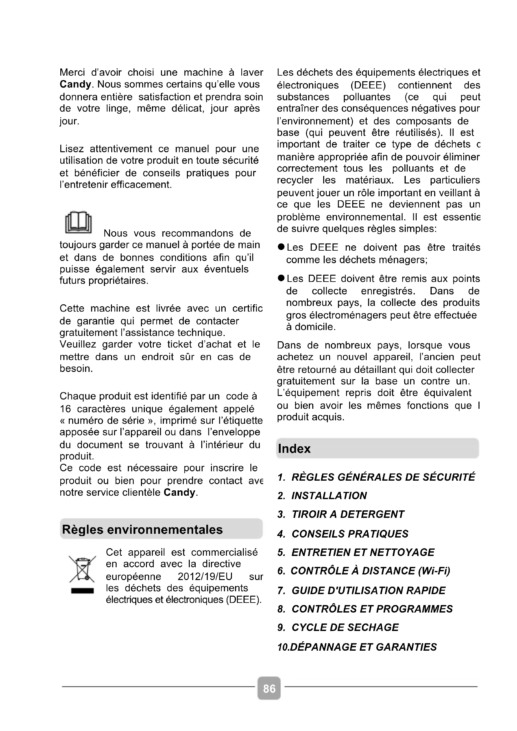 Merci d’avoir choisi une machine à laver Candy. Nous sommes certains qu’elle vous donnera entière satisfaction et prendra soin de votre linge, même délicat, jour après jour. Lisez attentivement ce manuel pour une utilisation de votre produit en toute sécurité et bénéficier de conseils pratiques pour l’entretenir efficacement. Nous vous recommandons de toujours garder ce manuel à portée de main et dans de bonnes conditions afin qu’il puisse également servir aux éventuels futurs propriétaires. Cette machine est livrée avec un certificat de garantie qui permet de contacter gratuitement l’assistance technique. Veuillez garder votre ticket d’achat et le mettre dans un endroit sûr en cas de besoin. Chaque produit est identifié par un code à 16 caractères unique également appelé « numéro de série », imprimé sur l’étiquette apposée sur l’appareil ou dans l’enveloppe du document se trouvant à l’intérieur du produit. Ce code est nécessaire pour inscrire le produit ou bien pour prendre contact avec notre service clientèle Candy.