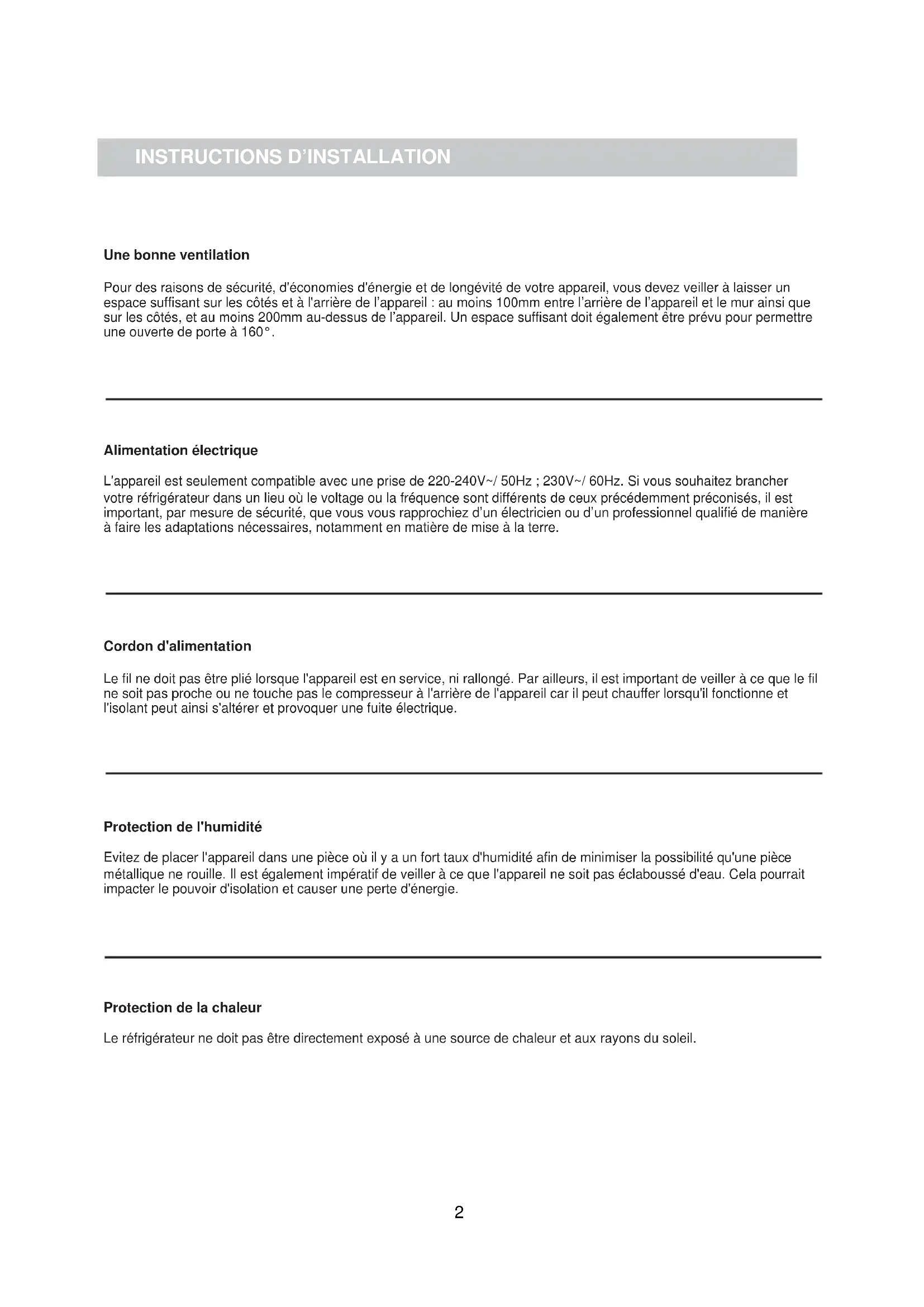Protection de la chaleur Le réfrigérateur ne doit pas être directement exposé à une source de chaleur et aux rayons du soleil.