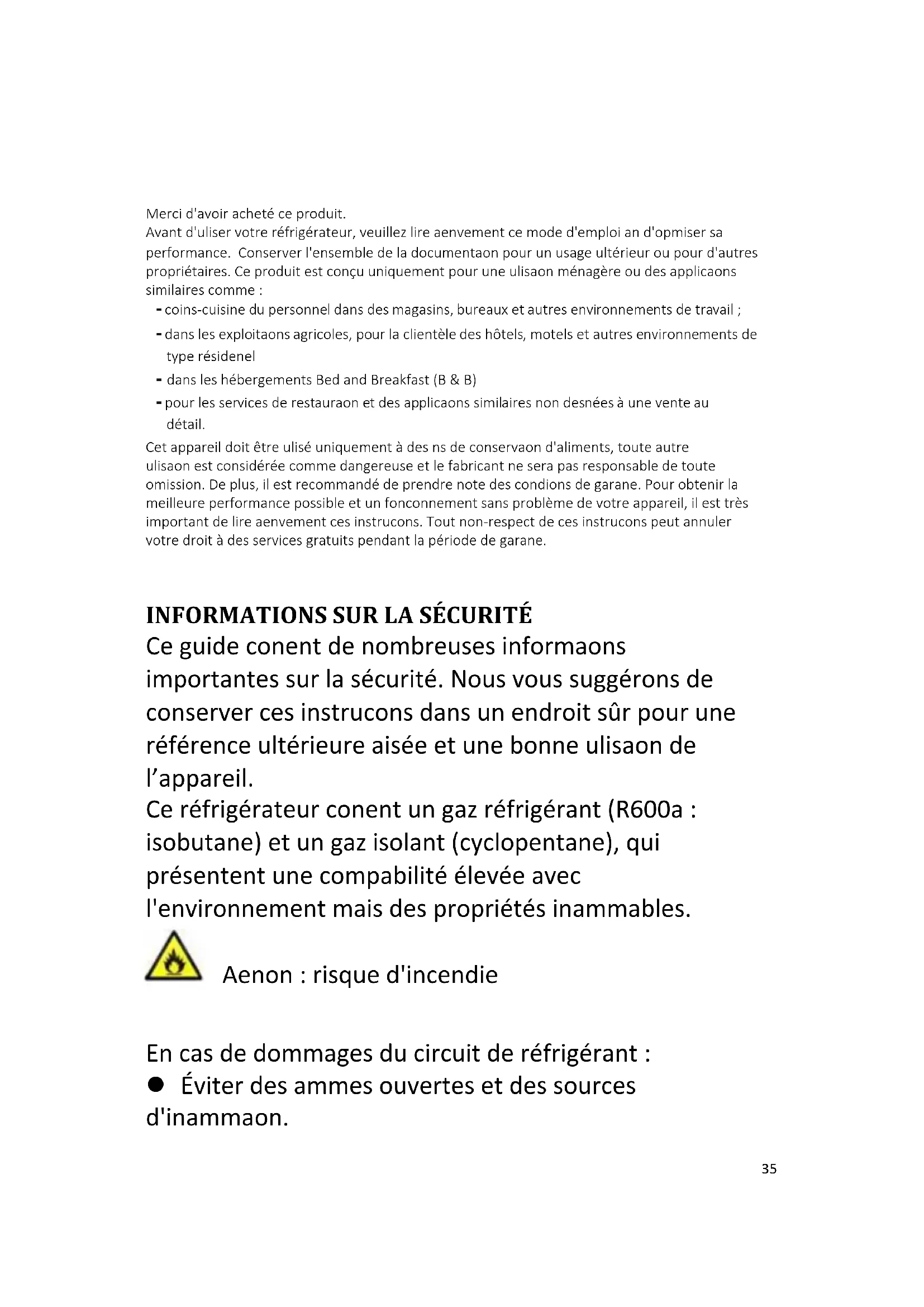 Ce guide contient de nombreuses informations importantes sur la sécurité. Nous vous suggérons de conserver ces instructions dans un endroit sûr pour une référence ultérieure aisée et une bonne utilisation de l’appareil. Ce réfrigérateur contient un gaz réfrigérant (R600a : isobutane) et un gaz isolant (cyclopentane), qui présentent une compatibilité élevée avec l'environnement mais des propriétés inflammables. Attention : risque d'incendie En cas de dommages du circuit de réfrigérant : Éviter des flammes ouvertes et des sources d'inflammation.36 Bien aérer la pièce dans laquelle se trouve l'appareil. tionnement 30 min,arrêt l5 m AVERTISSEMENT ! Il convient de prêter une attention particulière lors du nettoyage/du transport de l’appareil pour éviter de toucher les fils métalliques du condenseur à l’arrière de l’appareil, en raison du risque de blessures aux doigts et aux mains et du risque de détérioration de l’appareil. Cet appareil n'est pas conçu pour être empilé avec un autre appareil. Ne pas essayer de s'asseoir ou de se tenir debout sur le dessus de votre appareil étant donné qu’il n’est pas conçu à cet effet. Vous pourriez vous blesser ou endommager l'appareil. Assurez-vous que le câble secteur ne se retrouve pas coincé sous l’appareil pendant et après le transport/le déplacement de l'appareil, pour éviter de couper ou d’endommager le câble secteur. Au moment de positionner votre appareil, veillez à ne pas endommager votre plancher, vos tuyaux, les revêtements muraux etc. Ne déplacez pas l’appareil en le tirant par le couvercle ou la poignée. Ne laissez pas les enfants jouer avec l’appareil ou falsifier les commandes. Notre entreprise décline toute responsabilité en cas de non-respect des instructions. Ne pas installer l'appareil dans des endroits humides, huileux ou poussiéreux, ne pas l'exposer37 à la lumière directe du soleil et à l'eau. Ne pas installer l'appareil à proximité de radiateurs ou de matériaux inflammables. En cas de panne de courant, n'ouvrez pas le couvercle. Si la panne dure moins de 20 heures, les aliments surgelés ne devraient pas être affectés. Si la panne dure plus longtemps, alors il convient de vérifier les aliments et de les manger immédiatement ou bien de les cuire et de les congeler à nouveau. Si vous trouvez que le couvercle du congélateur coffre est difficile à ouvrir juste après l’avoir ouvert, ne soyez pas inquiet. Cela vient de la différence de pression qui doit s'égaliser et permettre au couvercle de s’ouvrir normalement après quelques minutes. Ne pas brancher l’appareil à l'alimentation électrique avant d’avoir retiré tous les protecteurs d'emballage et de transport. Le laisser reposer au moins 4 heures avant de l’allumer pour permettre à l'huile du compresseur de décanter s’il a été transporté horizontalement. Ce congélateur doit uniquement être utilisé aux fins prévues (c.-à-d. la conservation et la congélation de denrées comestibles). Ne pas conserver des médicaments ou des substances de recherche dans le rafraîchisseur de vin. Lorsque la matière à conserver requiert un contrôle strict des températures de conservation,38 il est possible qu'elle se détériore ou qu'une réaction incontrôlée se produise, laquelle peut entraîner des risques. Avant de procéder à tout fonctionnement, débrancher le cordon électrique de la prise électrique. A la livraison, vérifiez que le produit n'est pas endommagé et que toutes les pièces et les accessoires sont en parfait état. Si une fuite est détectée dans le système de réfrigération, ne pas toucher la sortie murale et ne pas utiliser de flammes ouvertes. Ouvrir la fenêtre et aérer la pièce. Ensuite appeler un service après- ventes pour demander une réparation. Ne pas utiliser de rallonges ni d'adaptateurs. Ne pas tirer ou plier de manière excessive le cordon d'alimentation ou ne pas toucher la fiche avec les mains mouillées. Ne pas endommager la fiche et/ou le cordon d'alimentation ; cela pourrait provoquer des chocs électriques ou des incendies. Si le câble d’alimentation est endommagé, il doit être remplacé par le fabriquant, un agent après- vente ou toute autre personne qualifiée pour éviter tout danger. Ne pas placer ou conserver des substances inflammables ou hautement volatiles tels que l'éther, le pétrole, le GPL, le gaz propane, les bombes d'aérosol, les colles, l'alcool pur etc. Ces39 substances peuvent provoquer une explosion. Ne pas utiliser ou conserver des sprays inflammables, tels que de la peinture en aérosol, auprès du rafraîchisseur de vin. Cela pourrait entraîner une explosion ou un incendie. Ne pas placer d'objets et/ou de récipients contenant de l'eau sur le dessus de l'appareil. Nous ne recommandons pas l'utilisation de rallonges et d’adaptateurs multiples. Ne pas jeter l'appareil au feu. Veiller à ne pas endommager le circuit/les tuyaux de refroidissement de l’appareil pendant le transport et l’utilisation. En cas de dommage, ne pas exposer l’appareil au feu, à une source d'inflammation potentielle et aérer immédiatement la pièce dans laquelle se trouve l’appareil. Le système de réfrigération positionné derrière et à l'intérieur du rafraîchisseur de vin contient du réfrigérant. Par conséquent, éviter d'endommager les tuyaux. Ne pas utiliser d’appareils électriques à l'intérieur des compartiments de conservation des aliments de l'appareil, sauf s'ils correspondent aux modèles recommandés par le fabricant. Ne pas endommager circuit réfrigérant. Ne pas utiliser de dispositifs mécaniques ou d’autres moyens pour accélérer le processus de dégivrage, hormis ceux recommandés par le fabricant.40 Ne pas utiliser d’appareils électriques à l'intérieur des compartiments de conservation des aliments, sauf s'ils correspondent aux modèles recommandés par le fabricant. Ne touchez pas aux pièc