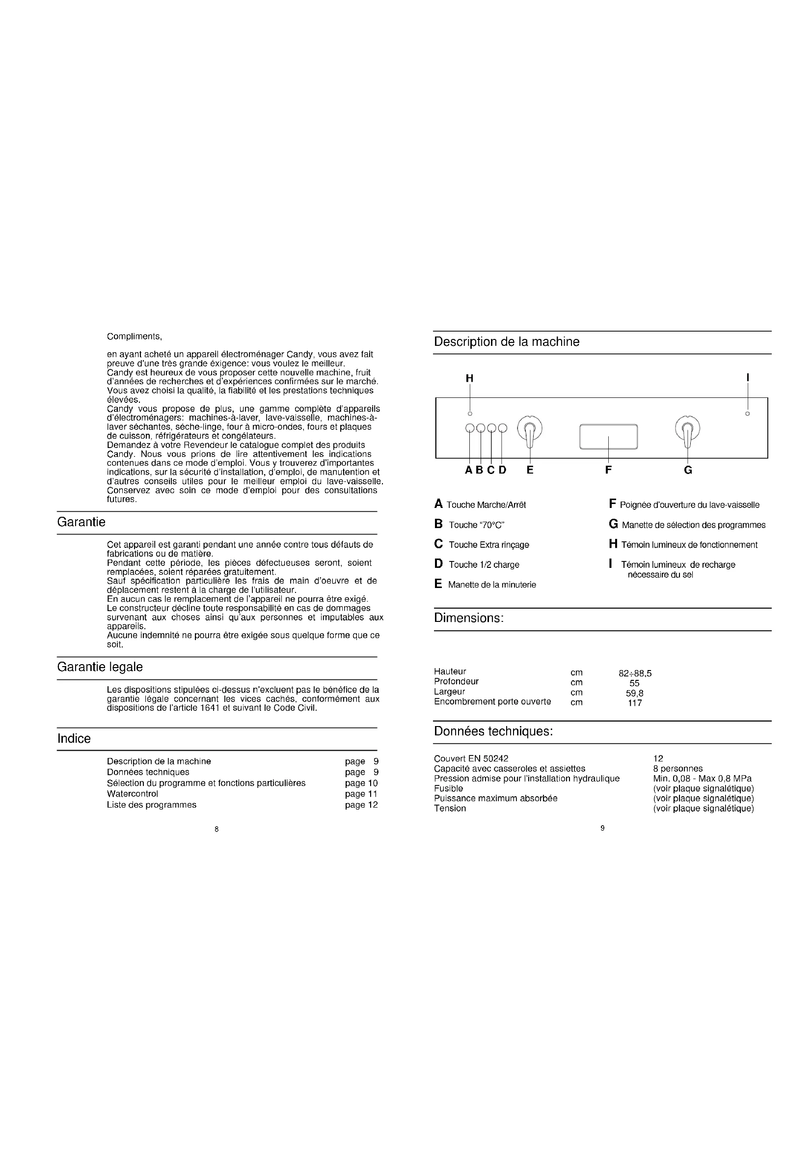 Description de la machine Données techniques: Dimensions: A Touche Marche/Arrêt B Touche “70°C” C Touche Extra rinçage D Touche 1/2 charge E Manette de la minuterie F Poignée d’ouverture du lave-vaisselle G Manette de sélection des programmes H Témoin lumineux de fonctionnement I Témoin lumineux de recharge nécessaire du sel Compliments, en ayant acheté un appareil électroménager Candy, vous avez fait preuve d’une très grande éxigence: vous voulez le meilleur. Candy est heureux de vous proposer cette nouvelle machine, fruit d’années de recherches et d’expériences confirmées sur le marché. Vous avez choisi la qualité, la fiabilité et les prestations techniques élevées. Candy vous propose de plus, une gamme complète d’appareils d’électroménagers: machines-à-laver, lave-vaisselle, machines-à- laver séchantes, séche-linge, four à micro-ondes, fours et plaques de cuisson, réfrigérateurs et congélateurs. Demandez à votre Revendeur le catalogue complet des produits Candy. Nous vous prions de lire attentivement les indications contenues dans ce mode d’emploi. Vous y trouverez d’importantes indications, sur la sécurité d’installation, d’emploi, de manutention et d’autres conseils utiles pour le meilleur emploi du lave-vaisselle. Conservez avec soin ce mode d’emploi pour des consultations futures. Cet appareil est garanti pendant une année contre tous défauts de fabrications ou de matière. Pendant cette période, les pièces défectueuses seront, soient remplacées, soient réparées gratuitement. Sauf spécification particulière les frais de main d’oeuvre et de déplacement restent à la charge de l’utilisateur. En aucun cas le remplacement de l’appareil ne pourra être exigé. Le constructeur décline toute responsabilité en cas de dommages survenant aux choses ainsi qu’aux personnes et imputables aux appareils. Aucune indemnité ne pourra être exigée sous quelque forme que ce soit. Les dispositions stipulées ci-dessus n’excluent pas le bénéfice de la garantie légale concernant les vices cachés, conformément aux dispositions de l’article 1641 et suivant le Code Civil. Description de la machine Données techniques Sélection du programme et fonctions particulières Watercontrol Liste des programmes page 9 page 9 page 10 page 11 page 12 Garantie Garantie legale Indice