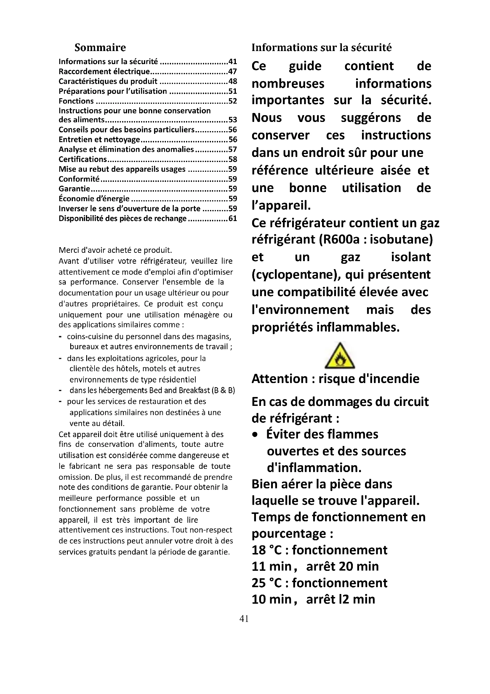Merci d'avoir acheté ce produit. Avant d'utiliser votre réfrigérateur, veuillez lire attentivement ce mode d'emploi afin d'optimiser sa performance. Conserver l'ensemble de la documentation pour un usage ultérieur ou pour d'autres propriétaires. Ce produit est conçu uniquement pour une utilisation ménagère ou des applications similaires comme : - coins-cuisine du personnel dans des magasins, bureaux et autres environnements de travail ; - dans les exploitations agricoles, pour la clientèle des hôtels, motels et autres environnements de type résidentiel - dans les hébergements Bed and Breakfast (B & B) - pour les services de restauration et des applications similaires non destinées à une vente au détail. Cet appareil doit être utilisé uniquement à des fins de conservation d'aliments, toute autre utilisation est considérée comme dangereuse et le fabricant ne sera pas responsable de toute omission. De plus, il est recommandé de prendre note des conditions de garantie. Pour obtenir la meilleure performance possible et un fonctionnement sans problème de votre appareil, il est très important de lire attentivement ces instructions. Tout non-respect de ces instructions peut annuler votre droit à des services gratuits pendant la période de garantie. Informations sur la sécurité Ce guide contient de nombreuses informations importantes sur la sécurité. Nous vous suggérons de conserver ces instructions dans un endroit sûr pour une référence ultérieure aisée et une bonne utilisation de l’appareil. Ce réfrigérateur contient un gaz réfrigérant (R600a : isobutane) et un gaz isolant (cyclopentane), qui présentent une compatibilité élevée avec l'environnement mais des propriétés inflammables. Attention : risque d'incendie En cas de dommages du circuit de réfrigérant :