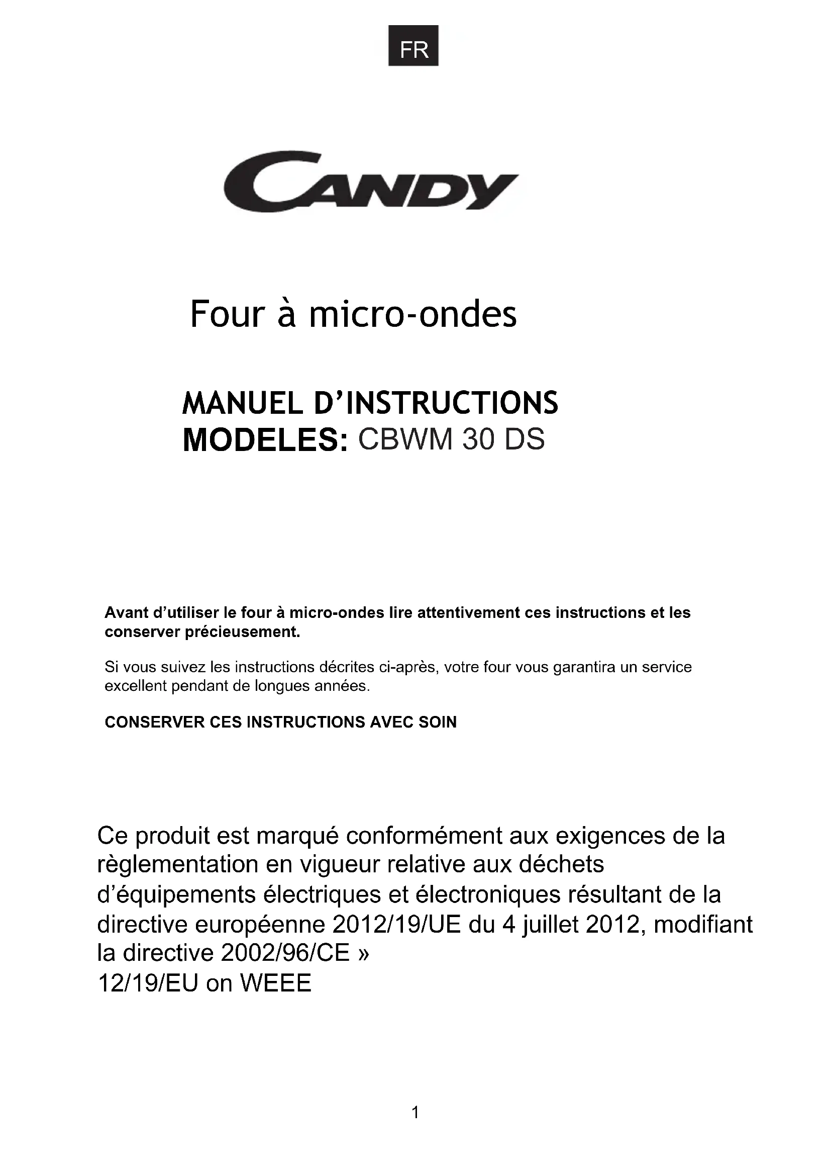 CBWM 30 DS - Four à micro-ondes CANDY - Notice d'utilisation et mode d'emploi gratuit