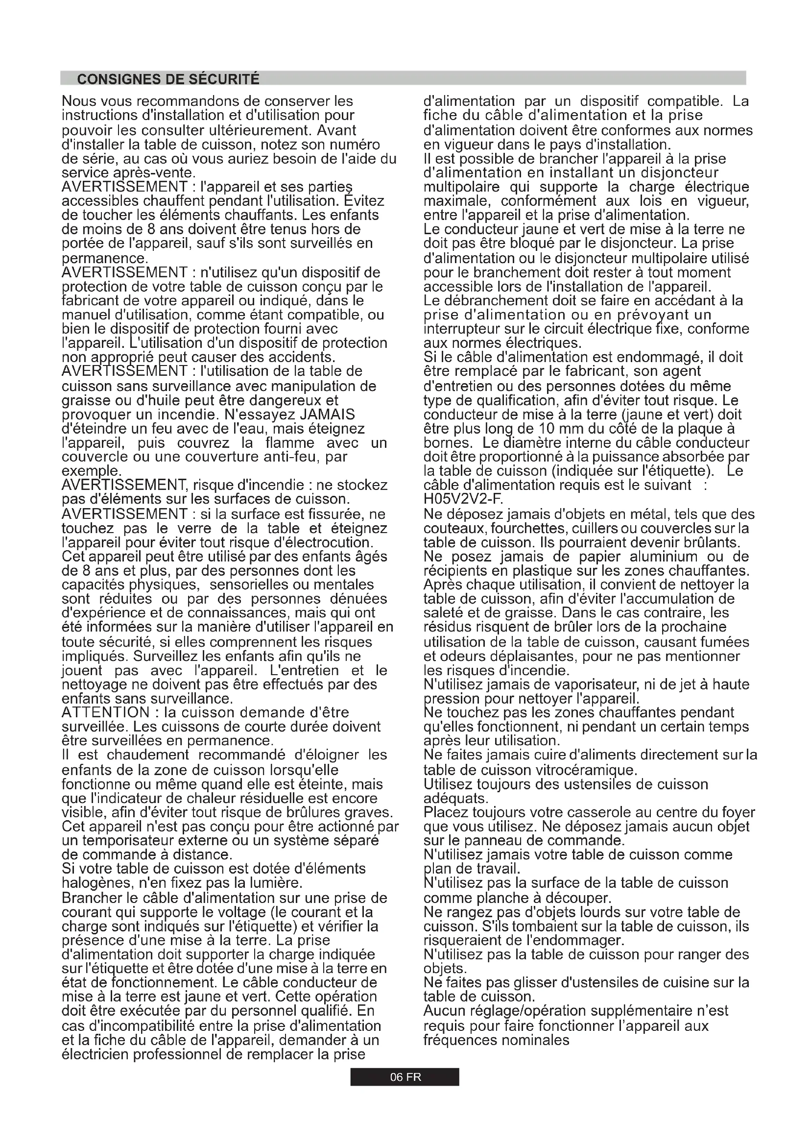 touchez pas le verre de la table et éteignez l'appareil pour éviter tout risque d'électrocution. Cet appareil peut être utilisé par des enfants âgés de 8 ans et plus, par des personnes dont les capacités physiques, sensorielles ou mentales sont réduites ou par des personnes dénuées d'expérience et de connaissances, mais qui ont été informées sur la manière d'utiliser l'appareil en toute sécurité, si elles comprennent les risques impliqués. Surveillez les enfants afin qu'ils ne jouent pas avec l'appareil. L'entretien et le nettoyage ne doivent pas être effectués par des enfants sans surveillance. ATTENTION : la cuisson demande d'être surveillée. Les cuissons de courte durée doivent être surveillées en permanence. Il est chaudement recommandé d'éloigner les enfants de la zone de cuisson lorsqu'elle fonctionne ou même quand elle est éteinte, mais que l'indicateur de chaleur résiduelle est encore visible, afin d'éviter tout risque de brûlures graves. Cet appareil n'est pas conçu pour être actionné par un temporisateur externe ou un système séparé de commande à distance. Si votre table de cuisson est dotée d'éléments halogènes, n'en fixez pas la lumière. Brancher le câble d'alimentation sur une prise de courant qui supporte le voltage (le courant et la charge sont indiqués sur l'étiquette) et vérifier la présence d'une mise à la terre. La prise d'alimentation doit supporter la charge indiquée sur l'étiquette et être dotée d'une mise à la terre en état de fonctionnement. Le câble conducteur de mise à la terre est jaune et vert. Cette opération doit être exécutée par du personnel qualifié. En cas d'incompatibilité entre la prise d'alimentation et la fiche du câble de l'appareil, demander à un électricien professionnel de remplacer la prise