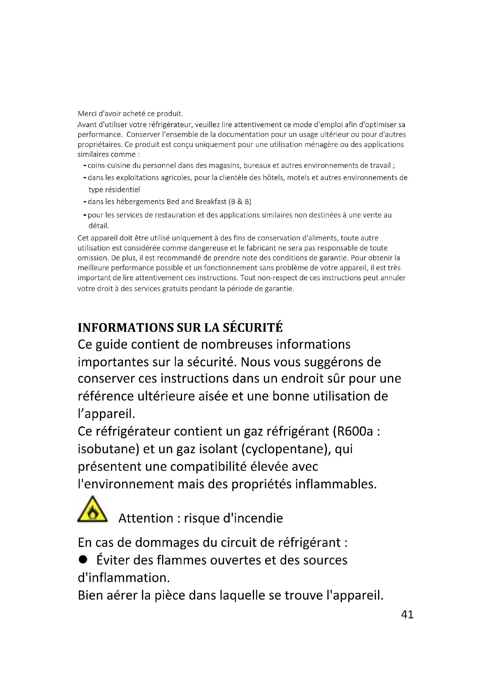 Ce guide contient de nombreuses informations importantes sur la sécurité. Nous vous suggérons de conserver ces instructions dans un endroit sûr pour une référence ultérieure aisée et une bonne utilisation de l’appareil. Ce réfrigérateur contient un gaz réfrigérant (R600a : isobutane) et un gaz isolant (cyclopentane), qui présentent une compatibilité élevée avec l'environnement mais des propriétés inflammables. Attention : risque d'incendie En cas de dommages du circuit de réfrigérant : Éviter des flammes ouvertes et des sources d'inflammation. Bien aérer la pièce dans laquelle se trouve l'appareil.42 rcentage :fonctionnement 30 min,arrêt l5 m AVERTISSEMENT !