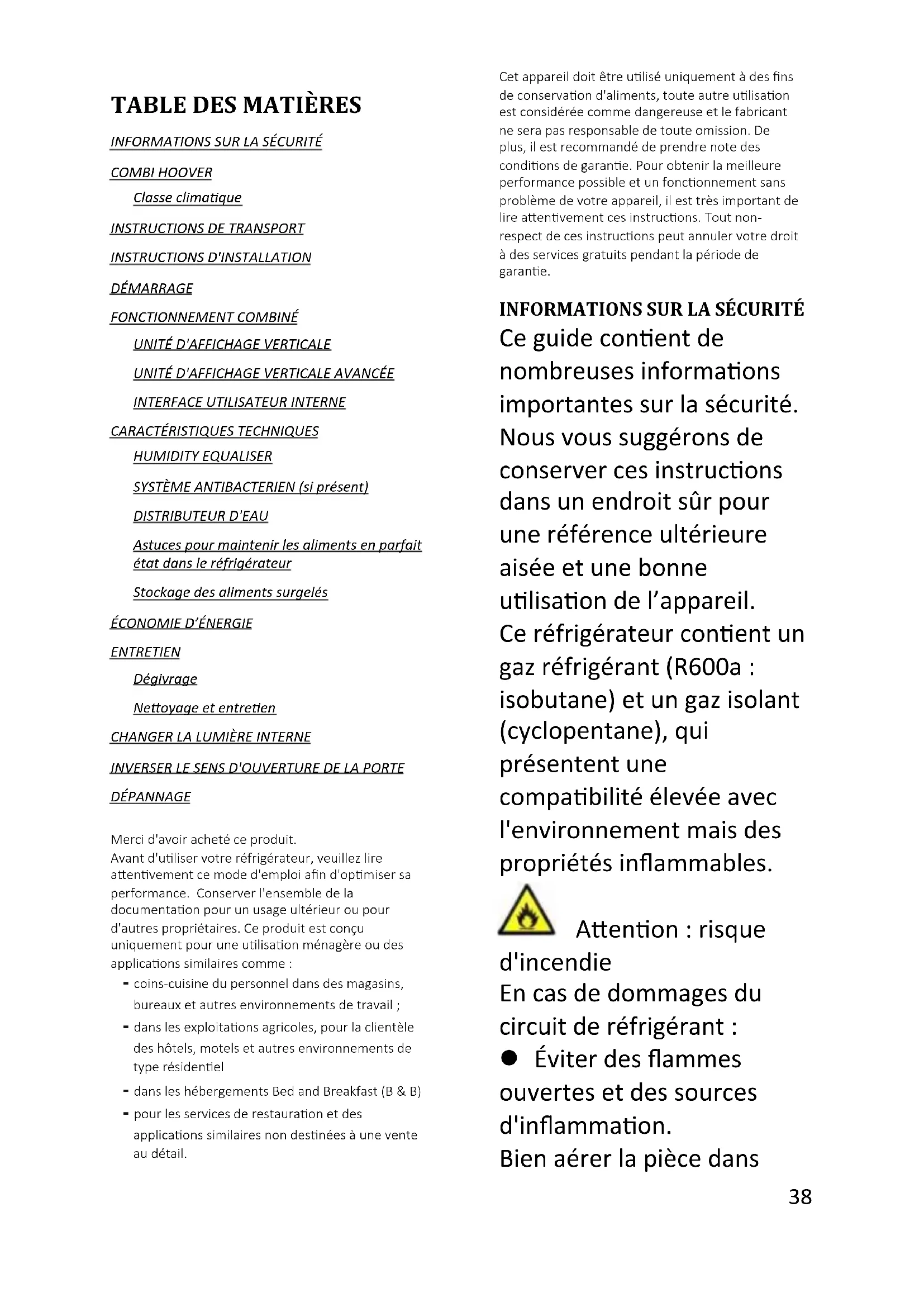 INFORMATIONS SUR LA SÉCURITÉ COMBI HOOVER Classe climatique INSTRUCTIONS DE TRANSPORT INSTRUCTIONS D'INSTALLATION DÉMARRAGE FONCTIONNEMENT COMBINÉ UNITÉ D'AFFICHAGE VERTICALE UNITÉ D'AFFICHAGE VERTICALE AVANCÉE INTERFACE UTILISATEUR INTERNE CARACTÉRISTIQUES TECHNIQUES HUMIDITY EQUALISER SYSTÈME ANTIBACTERIEN (si présent) DISTRIBUTEUR D'EAU Astuces pour maintenir les aliments en parfait état dans le réfrigérateur Stockage des aliments surgelés ÉCONOMIE D’ÉNERGIE ENTRETIEN Dégivrage Nettoyage et entretien CHANGER LA LUMIÈRE INTERNE INVERSER LE SENS D'OUVERTURE DE LA PORTE DÉPANNAGE Merci d'avoir acheté ce produit. Avant d'utiliser votre réfrigérateur, veuillez lire attentivement ce mode d'emploi afin d'optimiser sa performance. Conserver l'ensemble de la documentation pour un usage ultérieur ou pour d'autres propriétaires. Ce produit est conçu uniquement pour une utilisation ménagère ou des applications similaires comme : - coins-cuisine du personnel dans des magasins, bureaux et autres environnements de travail ; - dans les exploitations agricoles, pour la clientèle des hôtels, motels et autres environnements de type résidentiel - dans les hébergements Bed and Breakfast (B & B) - pour les services de restauration et des applications similaires non destinées à une vente au détail. Cet appareil doit être utilisé uniquement à des fins de conservation d'aliments, toute autre utilisation est considérée comme dangereuse et le fabricant ne sera pas responsable de toute omission. De plus, il est recommandé de prendre note des conditions de garantie. Pour obtenir la meilleure performance possible et un fonctionnement sans problème de votre appareil, il est très important de lire attentivement ces instructions. Tout non-respect de ces instructions peut annuler votre droit à des services gratuits pendant la période de garantie.