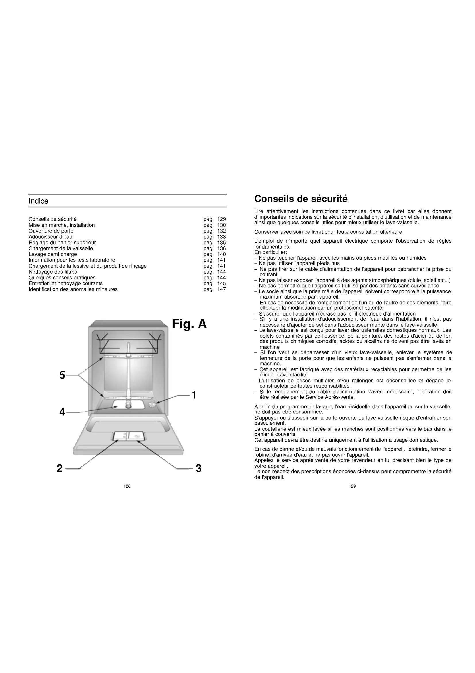 Indice Conseils de sécurité Mise en marche, installation Ouverture de porte Adoucisseur d’eau Réglage du panier supérieur Chargement de la vaisselle Lavage demi charge Information pour les tests laboratoire Chargement de la lessive et du produit de rinçage Nettoyage des filtres Quelques conseils pratiques Entretien et nettoyage courants Identification des anomalies mineures pag. 129 pag. 130 pag. 132 pag. 133 pag. 135 pag. 136 pag. 140 pag. 141 pag. 141 pag. 144 pag. 144 pag. 145 pag. 147