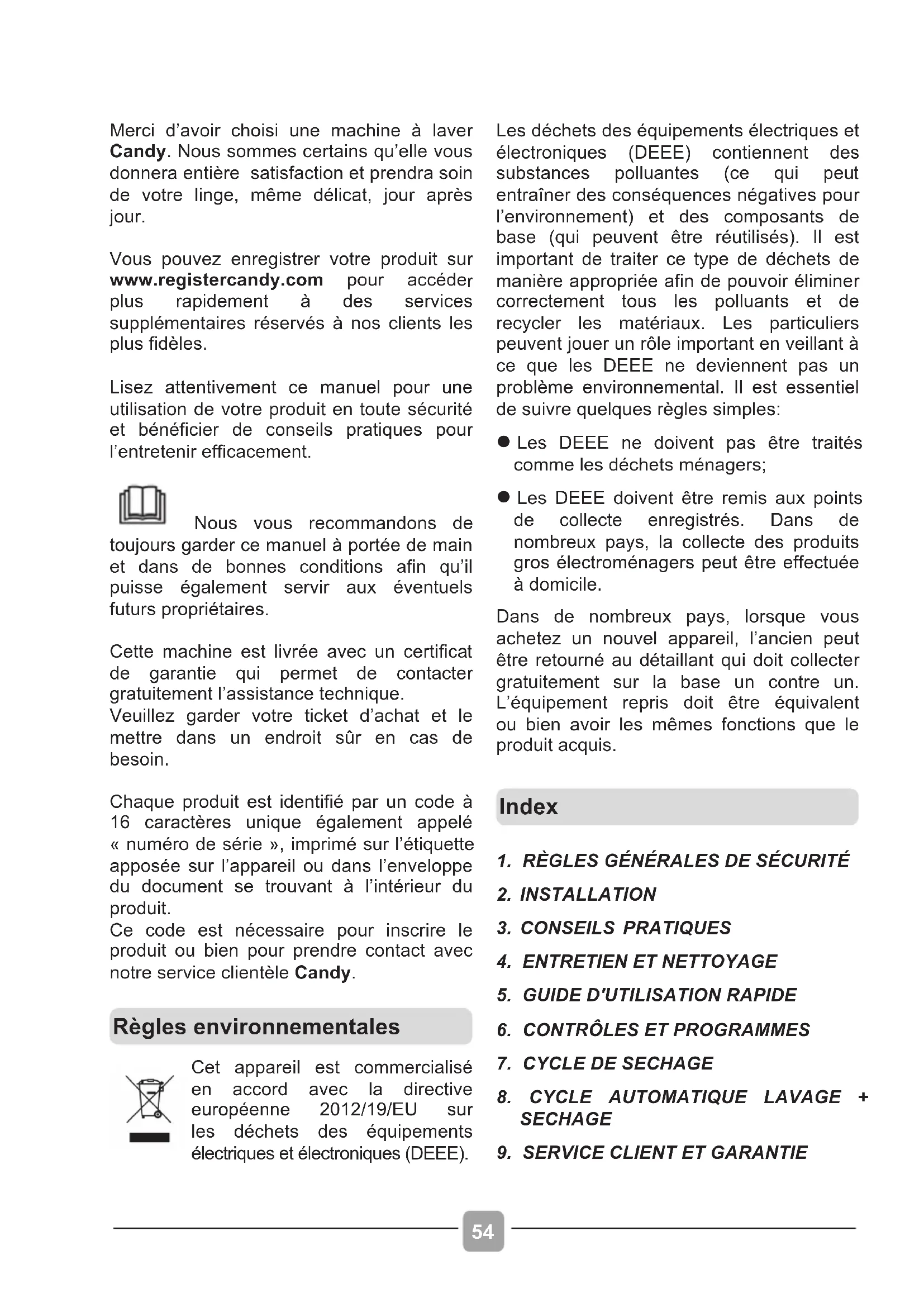 Garantie Le produit est garanti selon les termes et conditions énoncées dans le certificat fourni avec le produit. Le certificat de garantie doit être dûment rempli et conservé, de façon à être montré en cas de besoin. Enregistrez votre produit! Ne perdez pas de temps, inscrivez votre machine à laver sur www.registercandy.com ou en appelant le numéro indiqué sur le matériel.FR