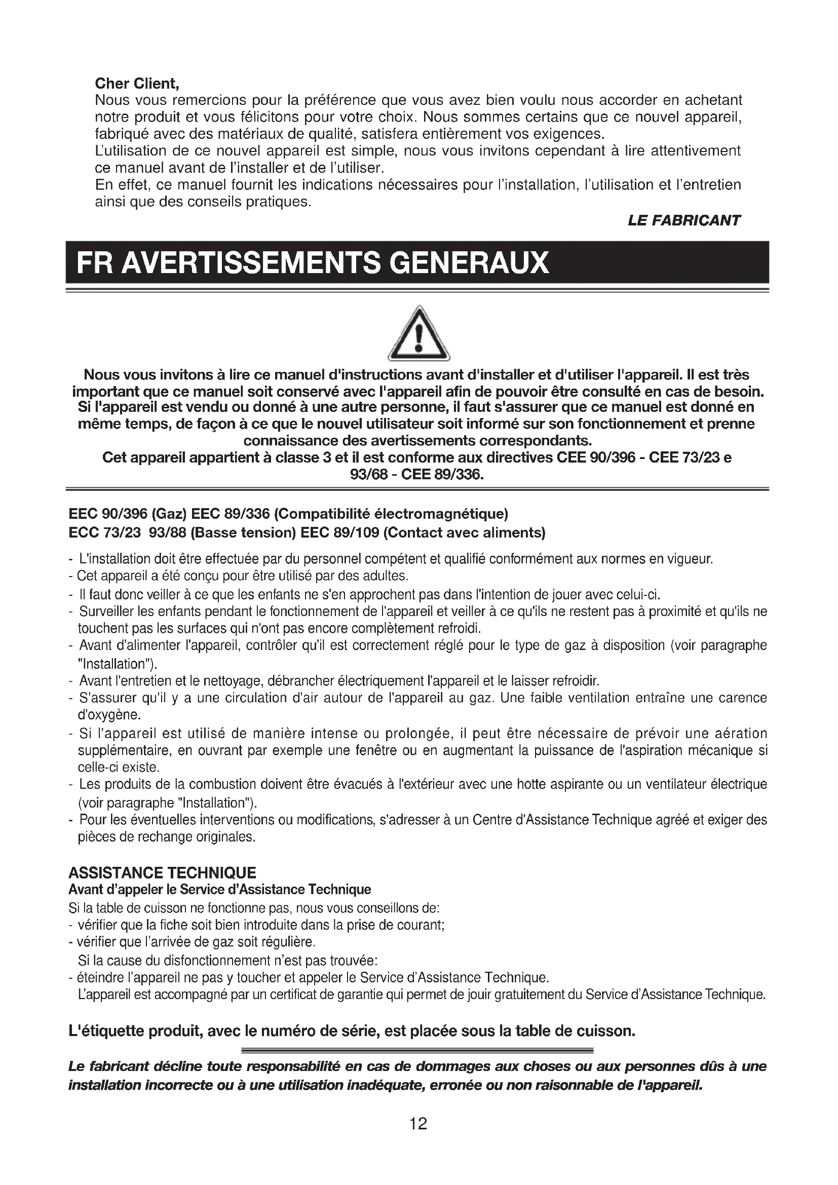 vérifier que la fiche soit bien introduite dans la prise de courant; - vérifier que l’arrivée de gaz soit régulière. Si la cause du disfonctionnement n’est pas trouvée: - éteindre l’appareil ne pas y toucher et appeler le Service d’Assistance Technique. L’appareil est accompagné par un certificat de garantie qui permet de jouir gratuitement du Service d’Assistance Technique. L'étiquette produit, avec le numéro de série, est placée sous la table de cuisson. Le fabricant décline toute responsabilité en cas de dommages aux choses ou aux personnes dûs à une installation incorrecte ou à une utilisation inadéquate, erronée ou non raisonnable de l'appareil. Nous vous invitons à lire ce manuel d'instructions avant d'installer et d'utiliser l'appareil. Il est très important que ce manuel soit conservé avec l'appareil afin de pouvoir être consulté en cas de besoin. Si l'appareil est vendu ou donné à une autre personne, il faut s'assurer que ce manuel est donné en même temps, de façon à ce que le nouvel utilisateur soit informé sur son fonctionnement et prenne connaissance des avertissements correspondants. Cet appareil appartient à classe 3 et il est conforme aux directives CEE 90/396 - CEE 73/23 e 93/68 - CEE 89/336.13