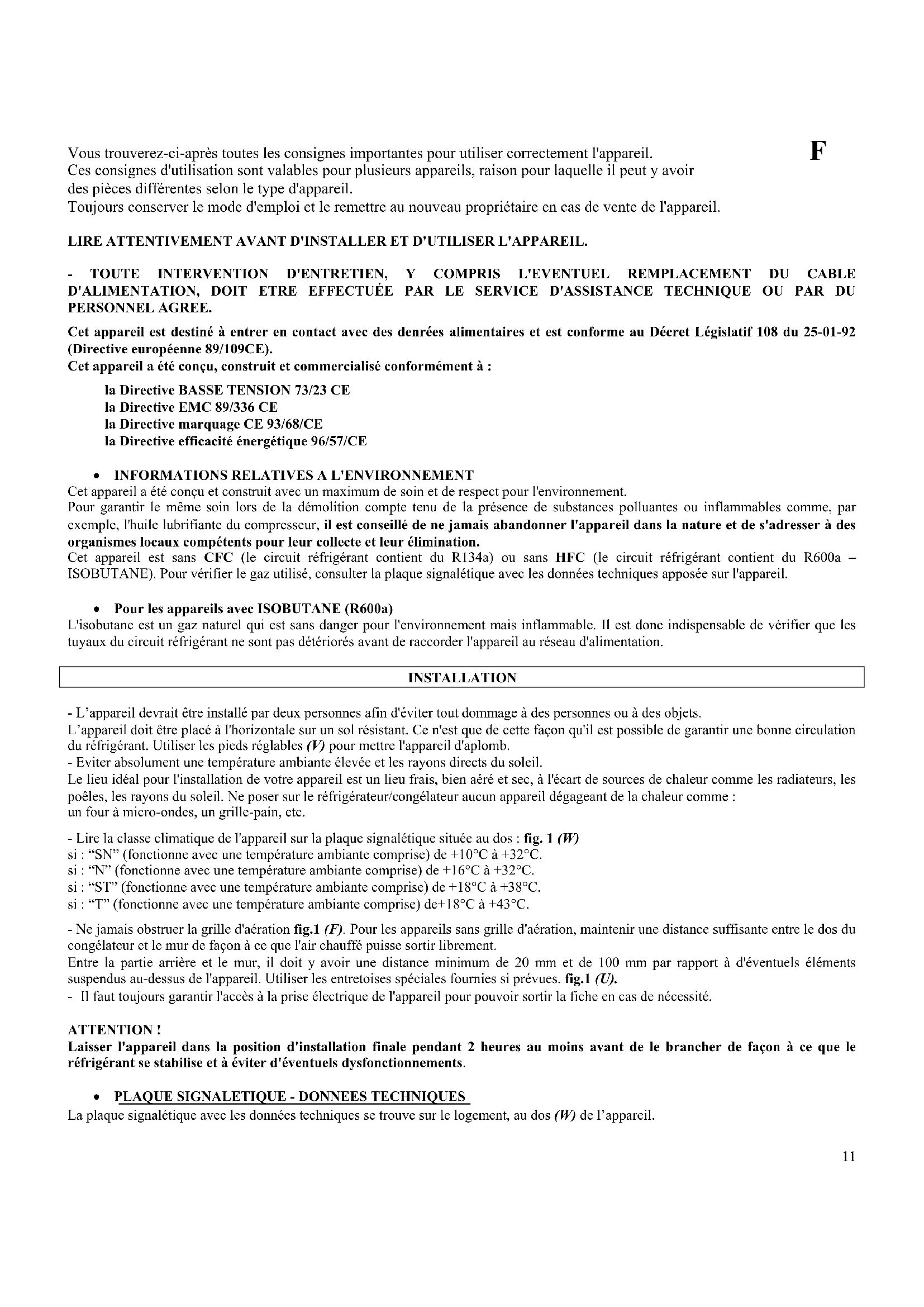 - Pour les appareils avec ISOBUTANE (R600a) L'isobutane est un gaz naturel qui est sans danger pour l'environnement mais inflammable. Il est donc indispensable de vérifier que les tuyaux du circuit réfrigérant ne sont pas détériorés avant de raccorder l'appareil au réseau d'alimentation. INSTALLATION - L’appareil devrait être installé par deux personnes afin d'éviter tout dommage à des personnes ou à des objets. L’appareil doit être placé à l'horizontale sur un sol résistant. Ce n'est que de cette façon qu'il est possible de garantir une bonne circulation du réfrigérant. Utiliser les pieds réglables (V) pour mettre l'appareil d'aplomb. - Eviter absolument une température ambiante élevée et les rayons directs du soleil. Le lieu idéal pour l'installation de votre appareil est un lieu frais, bien aéré et sec, à l'écart de sources de chaleur comme les radiateurs, les poêles, les rayons du soleil. Ne poser sur le réfrigérateur/congélateur aucun appareil dégageant de la chaleur comme : un four à micro-ondes, un grille-pain, etc. - Lire la classe climatique de l'appareil sur la plaque signalétique située au dos : fig. 1 (W) si : “SN” (fonctionne avec une température ambiante comprise) de +10°C à +32°C. si : “N” (fonctionne avec une température ambiante comprise) de +16°C à +32°C. si : “ST” (fonctionne avec une température ambiante comprise) de +18°C à +38°C. si : “T” (fonctionne avec une température ambiante comprise) de+18°C à +43°C. - Ne jamais obstruer la grille d'aération fig.1 (F). Pour les appareils sans grille d'aération, maintenir une distance suffisante entre le dos du congélateur et le mur de façon à ce que l'air chauffé puisse sortir librement. Entre la partie arrière et le mur, il doit y avoir une distance minimum de 20 mm et de 100 mm par rapport à d'éventuels éléments suspendus au-dessus de l'appareil. Utiliser les entretoises spéciales fournies si prévues. fig.1 (U). - Il faut toujours garantir l'accès à la prise électrique de l'appareil pour pouvoir sortir la fiche en cas de nécessité. ATTENTION ! Laisser l'appareil dans la position d'installation finale pendant 2 heures au moins avant de le brancher de façon à ce que le réfrigérant se stabilise et à éviter d'éventuels dysfonctionnements.