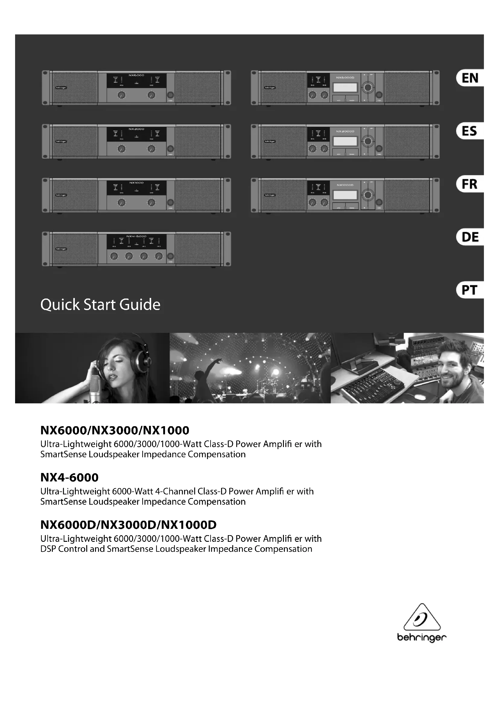 - • And then, reset the breaker, connect the unit to the mains, switch ON and slowly increase the gain to the target volume XLR Plug ¼" TS Plug ¼" TRS Plug18 19NX6000/NX3000/NX1000/NX4-6000/NX6000D/NX3000D/NX1000D Quick Start Guide (1) POIGNÉES Fixez l’ampli cateur au boitier Rack en utilisant quatre vis et rondelles (non fournies). Cet ampli cateur utilise deux espaces Rack en hauteur. (2) VENTILATEUR La vitesse du ventilateur se regle automatiquement. (3) LES RÉGLAGES D’ENTRÉE permettent de régler le volume d’entrée. Pour augmenter le gain, tournez le potentiomètre vers la droite; pour le diminuer, tournez-le vers la gauche. (4) Les LEDS SIGNAL, LIMIT et PROTECT donnent des indications quant au niveau du signal et à l’état du système pour chaque canal. Les LEDs SIGNAL s’allument pour indiquer le niveau du signal d’entrée. La LED LIMIT s’allume lorsque le niveau du signal d’entrée est trop élevé, ce qui entraine l’activation du limiteur interne. Réduisez le niveau d’entrée si la LED rouge LIMIT s’allume de manière continue. La LED PROTECT s’allume pour indiquer qu’un problème de fonctionnement est survenu (surtension, surchau e, etc.). Si un problème apparait, la LED PROTECT s’allume et le canal correspondant est automatiquement coupé jusqu’à ce que le problème soit résolu, après quoi la LED PROTECT s’éteint et l’ampli reprend son fonctionnement normal. (5) Le bouton SETUP permet la navigation a travers les paramètres des modules du DSP. (6) L'ECRAN LCD a che le module DSP ainsi que les réglages utilisés. (7) Le bouton PROCESS permet de naviguer dans les modules de traitement digital du signal (DSP). (8) Les boutons HAUT/BAS permettent de naviguer entre les di érents modules DSP. (9) Le bouton EXIT permet de retourner à l’écran principal du menu DSP. (10) Le bouton SELECT permet de basculer entre les modes Graphic et Edit (en appuyant sur le bouton) et changer la valeur des paramètres (en le tournant). (11) INTERRUPTEUR SECTEUR Appuyez sur ce bouton pour placer l’ampli cateur sous/hors tension. (12) EMBASE SECTEUR Connectez le cordon secteur fourni a cette embase. (13) Les sorties OUTPUTS permettent de connecter l’ampli à des enceintes avec des câble pour haut-parleurs professionnels dotés de connecteurs à verrouillage. (14) Le TABLEAU DE BROCHAGE indique les di érentes con gurations de brochages/ connexion de canaux possibles pour chaque sortie. (15) VENTILATEUR La vitesse du ventilateur se regle automatiquement. (16) ENTRÉES Connectez votre le signal d’entree a l’ampli a l’aide des embases Jack stereo 6,35 mm, XLR, ou RCA. L’entree Jack recoit les ches symetriques (Jack stereo) ou asymetriques (Jack mono). (17) La connexion USB permet les mises à jour du logiciel et le contrôle des paramètres par ordinateur. Consultez le site behringer. com pour télécharger le logiciel de gestion DSP sur votre ordinateur. (18) Le commutateur BREAKER (fusible automatique, NX6000D uniquement) remplace un fusible classique. Si la protection a sauté, une simple pres-sion sur ce commutateur permet de la remettre en fonction une fois la cause du problème localisée et supprimée. AVERTISSEMENT QUANT AU DISJONCTEUR: E ectuez les actions suivantes AVANT de réarmer le disjoncteur: