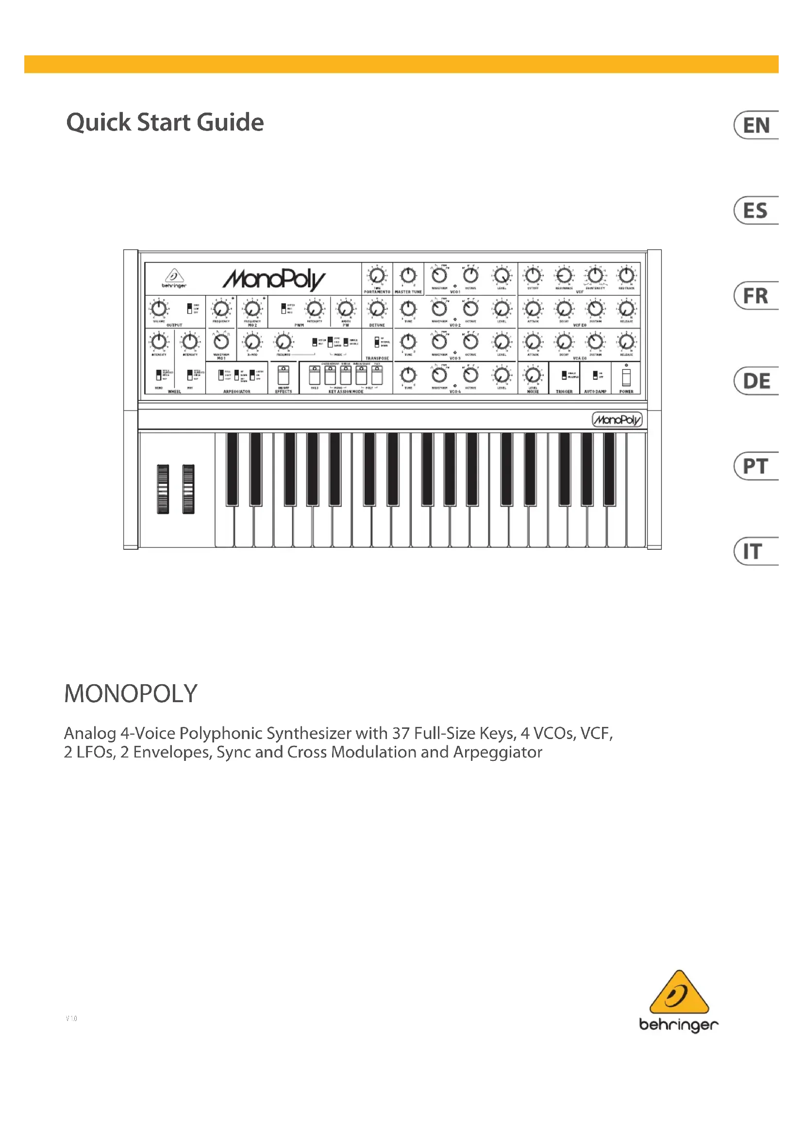dispositivo externo. (30) PORTAMENTO - use esta toma para activar o desactivar el portamento usando un pedal de disparo. (31) VCF – la frecuencia de corte del ltro puede ser modulada usando un pedal, tal como el pedal de expresión Behringer FCV100 V2 o el FC600 V2 (con la polaridad CV ajustada a TRS y usando un cable con conector TRS). (32) VCO – el tono también puede ser controlado por medio de un pedal, como uno de los mencionados arriba. (33) TRIG POLARITY – esto elige la polaridad de disparo de las tomas TRIG In y Out, entre +15V (positivo, disparo por voltaje) o masa (negativo, disparo por conmutador). (34) TRIG – conéctelo a las entradas y salidas de disparo de otra unidad MONOPOLY, sintetizador monofónico compatible u otro equipo modular. Ajuste el interruptor TRIG POLARITY para que coincida con las entradas y salidas de disparo de su equipo externo. TRIG OUT – conecte esta salida a la entrada de disparo de su equipo externo. El tipo de salida es ajustado por el interruptor TRIG POLARITY y sigue el ajuste del interruptor SINGLE/MULTIPLE TRIGGER del panel frontal. TRIG IN – conecte esta entrada a la salida de disparo de su equipo externo. Una señal de disparo activará todos los VCOs y disparará los generadores de envolvente de VCF y VCA. (35) CV – conecte esto a las entradas y salidas CV de otra unidad MONOPOLY, sintetizador monofónico compatible u otro equipo modular. Deberían usar el sistema de control por voltaje (1 V/octava). CV IN – conecte esta entrada a la salida CV de su equipo externo. Únicamente los voltajes externos aplicados a esta entrada controlarán la nota. Los VCOs estarán en el modo unísono mono. CV OUT – conecte esta salida a la entrada CV de su equipo externo. La salida es la de la nota más alta y la última tocada. El interruptor TRANSPOSE del panel frontal afectará al valor CV OUT en cambios de 1 voltio por octava. (36) PHONES – conecte sus auriculares a esta salida TRS de 6.3 mm. Asegúrese de reducir el volumen antes de conectar los auriculares. (37) OUTPUT – conecte esta salida TS de 6.3 mm a la entrada de nivel de línea de su equipo externo. MONOPOLY Controls16 MONOPOLY Quick Start Guide 17 (FR) Etape 2 : Réglages (1) CLAVIER – le clavier possède 37 touches semi lestées de taille normale. (2) MOLETTE MG1 – permet de régler l’intensité de la modulation. Le fonctionnement des deux molettes peut être réglé et personnalisé avec les commandes de la section WHEEL (7). (3) MOLETTE BEND – permet de modier le pitch vers le haut ou le bas. La molette revient en position centrale lorsqu’elle est relâchée. (4) KEY ASSIGN MODE – ces boutons permettent de modier le fonctionnement du clavier avec le synthétiseur (voir la section « mise en œuvre » pour plus de détails). HOLD – les notes jouées sont maintenues (activez l’un des 4 modes KEY ASSIGN avant d’utiliser la fonction HOLD). CHORD MEMORY – en mode POLY ou UNISON/SHARE, jouez et maintenez un accord puis enfoncez CHORD MEMORY. L’écart entre les notes est mémorisé et peut être rejoué en appuyant sur une seule touche. UNISON – ce mode monophonique utilise tous les VCO lorsque vous jouez une seule note. Chaque VCO peut être réglé individuellement. UNISON/SHARE – ce mode polyphonique partage automatiquement les notes jouées entre les VCO. POLY – dans ce mode polyphonique classique, les notes sont assignées à chaque VCO. (5) EFFECTS ON/OFF – permet d’activer/ désactiver les eets produits par les fonctions X-MOD/FREQ-MOD/MODE (voir ci-dessous). (6) ARPEGGIATOR – les trois sélecteurs permettent de régler l’arpégiateur : ALL/2OCT/1OCT – sélection de la plage d’octave. UP/DOWN/UP-DOWN – sélection de l’ordre de lecture des notes. LATCH/ON/OFF – sélectionnez LATCH pour que la séquence soit jouée même lorsque les touches sont relâchées. Sélectionnez ON ou OFF pour activer/désactiver la lecture de la séquence. Utilisez le potentiomètre MG2 FREQUENCY pour régler le tempo de l’arpégiateur. Assurez- vous que ce réglage n’est pas au minimum lors de la création de l’arpège. (7) WHEEL – cette section permet de régler le mode de fonctionnement et l’intensité des molettes BEND et MG1. INTENSITY – permet de régler l’intensité de l’eet de chaque molette. Au minimum, les molettes n’agissent pas sur le son. SELECTEUR – permet de régler le fonctionnement de chaque molette : VC0 1/SLAVE VCOs – la molette BEND agit sur le VCO1 si le bouton EFFECTS est sur OFF. Si EFFECTS est sur ON, la molette agit sur les VCO esclaves. La molette MG1 peut moduler le VCO1 ou les VCO esclaves. PITCH – la molette BEND agit sur le pitch de tous les VCO. La molette MG1 peut moduler le pitch. VCF – la molette BEND agit directement sur la fréquence de coupure du ltre et la molette MG1 permet de la moduler. (8) OUTPUT – permet de régler le volume général des sorties principales et du casque. Baissez complètement ce réglage avant de mettre le synthétiseur sous tension, de connecter un casque, des amplis externes ou tout autre type d’équipement externe. (9) FREQUENCY MG1 – permet de régler la fréquence du Modulation Generator 1 (MG1). La LED clignote à la fréquence sélectionnée. WAVEFORM MG1 – permet de sélectionner la forme de l’onde du MG1 parmi triangulaire, dent de scie inversée, dent de scie ou pulsation. (10) FREQUENCY MG2 - permet de régler la fréquence du Modulation Generator 2 (MG2). La LED clignote à la fréquence sélectionnée. Le MG2 dispose d’une onde triangulaire. (11) X-MOD/FREQ-MOD/MODE – ces réglages permettent de modier les eets. Utilisez l’interrupteur EFFECTS pour active/désactiver les eets. Les diérents eets sont générés par l’interaction d’un VCO maître et d’un VCO esclave. X-MOD – permet de régler le niveau de la modulation croisée en mode X-MOD ou S & X. FREQ MOD – le potentiomètre et le sélecteur permettent de régler la modulatio