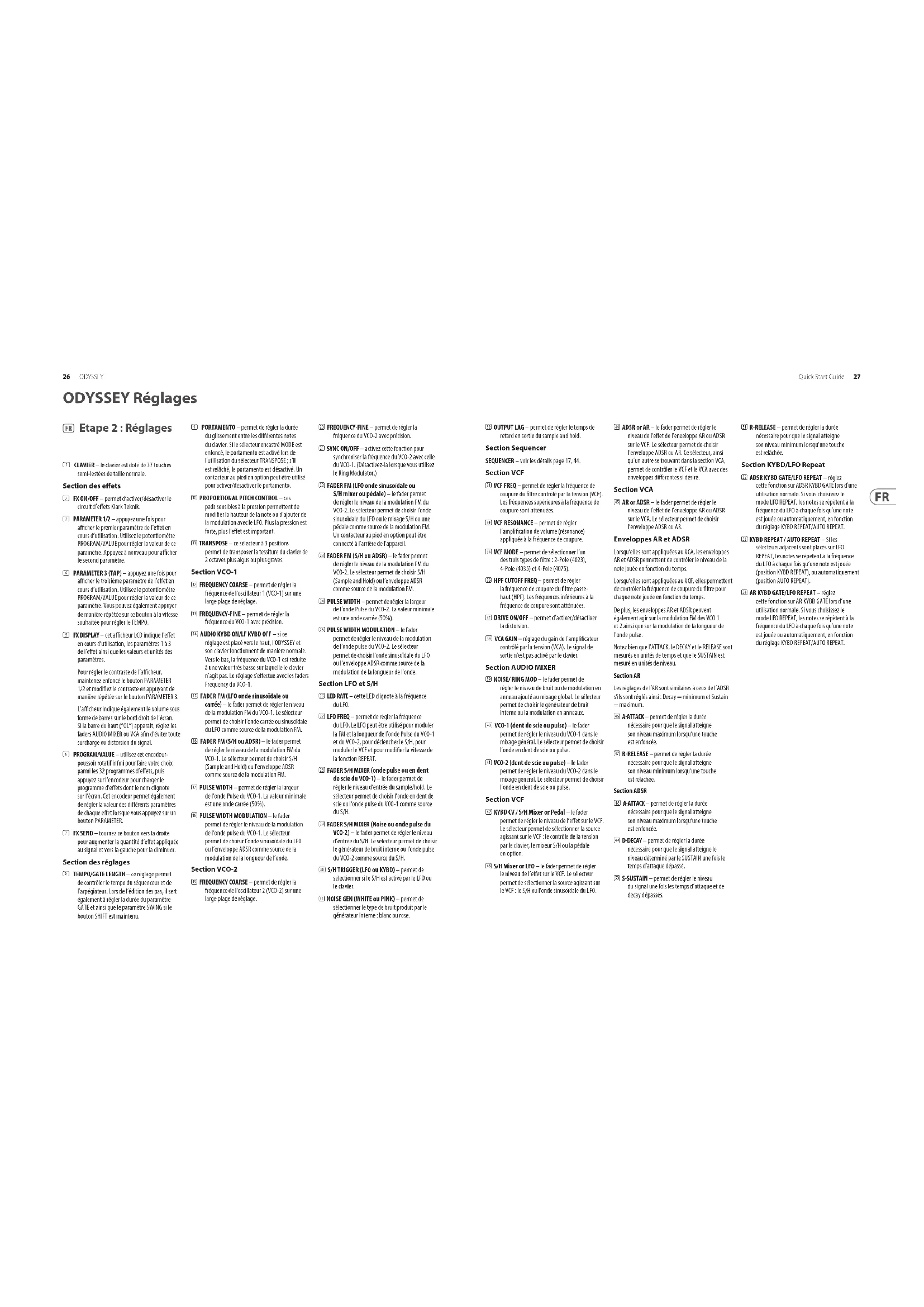 L’ODYSSEY dispose de faders pour régler le niveau du VCO-1, du VCO-2 et du générateur de bruit. Les VCO 1 et 2 peuvent générer des ondes en dent de scie ou pulse. Ces trois faders peuvent être combinés comme vous le souhaitez an de créer votre mixage audio. SECTIONS VCO-1 et VCO-2 Ajustez les faders FREQUENCY tout en jouant et vous pourrez entendre la fréquence des oscillateurs augmenter ou diminuer sur la plage disponible. Chaque VCO peut être modulé en FM soit par le LFO (avec une onde carrée ou sinusoïdale), le S/H ou l’enveloppe ADSR. Les faders FM permettent de régler la modulation FM pour chaque VCO. Utilisez le fader PULSE WIDTH pour régler la longueur de l’onde pulse. Le fader MOD permet de modier la longueur d’onde avec l’onde sinusoïdale du LFO ou l’enveloppe ADSR. SECTION SAMPLE and HOLD Le S/H peut être utilisé pour moduler de manière aléatoire le VCO-1, le VCO-2 et le VCF. Utilisez pour cela le sélecteur S/H de chaque section. La section S/H MIXER permet de mixer les sources utilisées pour le S/H: le VCO-1 (onde en dent de scie ou pulse), le générateur de bruit ou l’onde pulse du VCO-2. Utilisez chaque faders et écoutez le résultat. Si aucun sélecteur S/H n’est active, si les faders correspondant sont baissés ou si les faders S-H Mixer sont baissés, aucun eet n’est produit. Essayez de placer le sélecteur de modulation FM du VCO-1 sur S/H, de monter le fader correspondant puis de monter le fader S/H MIXER du VCO-1 (dent de scie ou pulse). Essayez de faire se déclencher le S/H grâce au LFO puis réglez la fréquence du LFO. SECTION VCF Réglez les faders VCF Frequency fader et VCF Resonance et écoutez le résultat produit sur le son. Alternez entre les diérents modes classiques avec le sélecteur VCF MODE. Le fader KYBD / S/H MIXER or PEDAL permet de régler l’intensité de l’eet produit sur le VCF par la hauteur de la note jouée, le S/H ou la pédale en option. Le fader S/H /LFO permet de régler la quantité de modulation appliquée au VCF. Sélectionnez le S/H ou le LFO comme source de la modulation. Bougez le fader et réglez le S/H ou la vitesse du LFO. Le fader ADSR/AR permet de régler l’intensité de l’eet qu’a l’enveloppe ADSR ou AR sur le VCF. SECTION VCA Le sélecteur VCA permet de choisir si le VCA est aecté par l’enveloppe ADSR ou AR. Ajustez le fader correspondant ainsi que le fader VCA GAIN si nécessaire. Le ltre passe-haut permet de couper toutes les basses fréquences indésirables. Activez la fonction DRIVE si nécessaire. SECTION ADSR and AR ENVELOPE Ces faders permettent de régler le VCA. Ils agissent sur le volume en fonction du temps. Il permettent également de modier le VCF. Ils agissent alors sur la fréquence de coupure en fonction du temps. La longueur des ondes pulse et la modulation FM des VCO 1 et 2 peuvent également être aectées par les réglages de l’enveloppe ADSR si les sélecteurs des sections VCO-1 et VCO-2 sont placés sur ADSR. PORTAMENTO Le fader PORTAMENTO permet de régler la durée du glissement entre les diérentes notes jouées. Un contacteur au pied en option permet d’activer/ désactiver le PORTAMENTO. ARPEGGIATOR Pour utiliser l’arpégiateur, appuyez sur le bouton ARP de la section SEQUENCER :