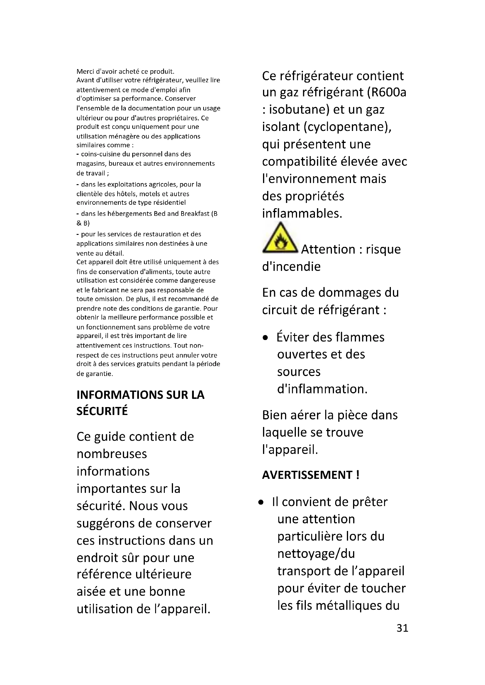 SÉCURITÉ Ce guide contient de nombreuses informations importantes sur la sécurité. Nous vous suggérons de conserver ces instructions dans un endroit sûr pour une référence ultérieure aisée et une bonne utilisation de l’appareil. Ce réfrigérateur contient un gaz réfrigérant (R600a : isobutane) et un gaz isolant (cyclopentane), qui présentent une compatibilité élevée avec l'environnement mais des propriétés inflammables. Attention : risque d'incendie En cas de dommages du circuit de réfrigérant :