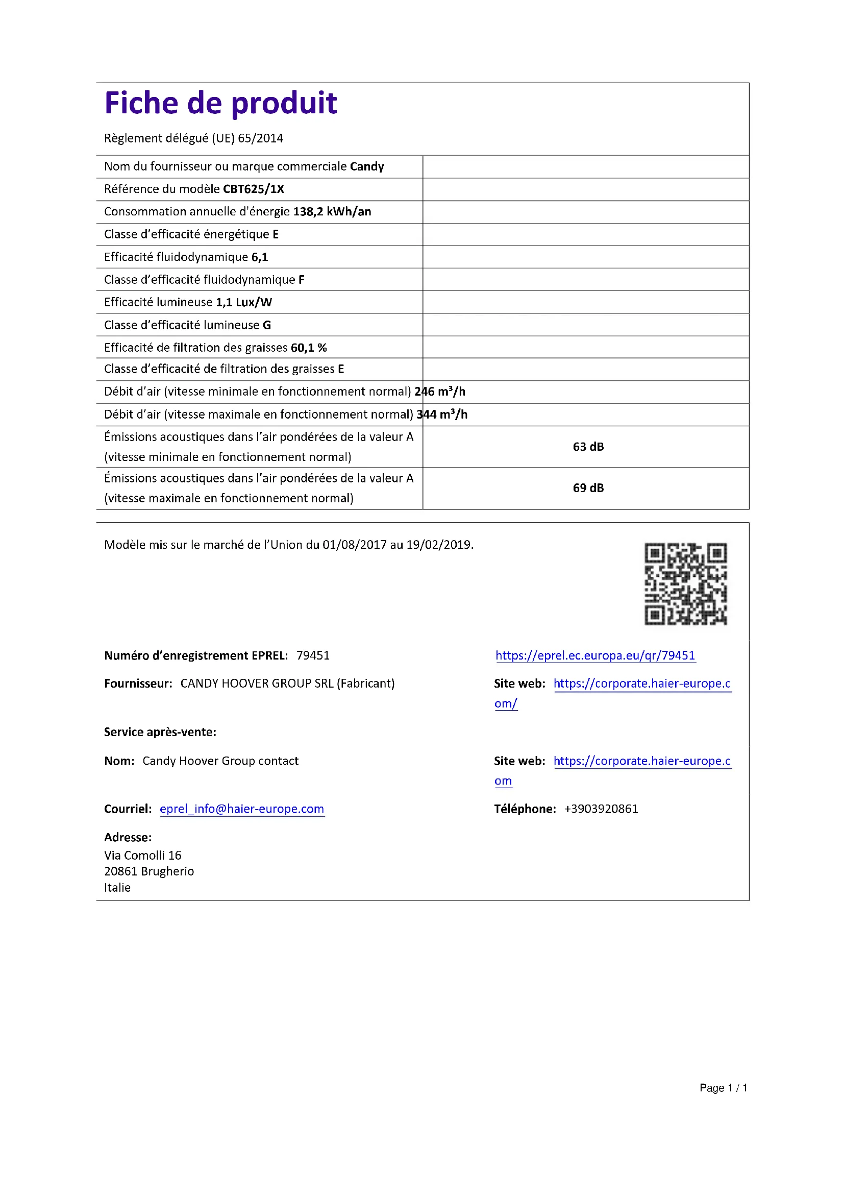 Fiche de produit Règlement délégué (UE) 65/2014 Nom du fournisseur ou marque commerciale Candy Référence du modèle CBT625/1X Consommation annuelle d'énergie 138,2 kWh/an Classe d’efficacité énergétique E Efficacité fluidodynamique 6,1 Classe d’efficacité fluidodynamique F Efficacité lumineuse 1,1 Lux/W Classe d’efficacité lumineuse G Efficacité de filtration des graisses 60,1 % Classe d’efficacité de filtration des graisses E Débit d’air (vitesse minimale en fonctionnement normal) 246 m³/h Débit d’air (vitesse maximale en fonctionnement normal) 344 m³/h Émissions acoustiques dans l’air pondérées de la valeur A (vitesse minimale en fonctionnement normal) 63 dB Émissions acoustiques dans l’air pondérées de la valeur A (vitesse maximale en fonctionnement normal) 69 dB Modèle mis sur le marché de l’Union du 01/08/2017 au 19/02/2019. Numéro d’enregistrement EPREL: 79451 https://eprel.ec.europa.eu/qr/79451 Fournisseur: CANDY HOOVER GROUP SRL (Fabricant) Site web: https://corporate.haier-europe.c om/ Service après-vente: Nom: Candy Hoover Group contact Site web: https://corporate.haier-europe.c