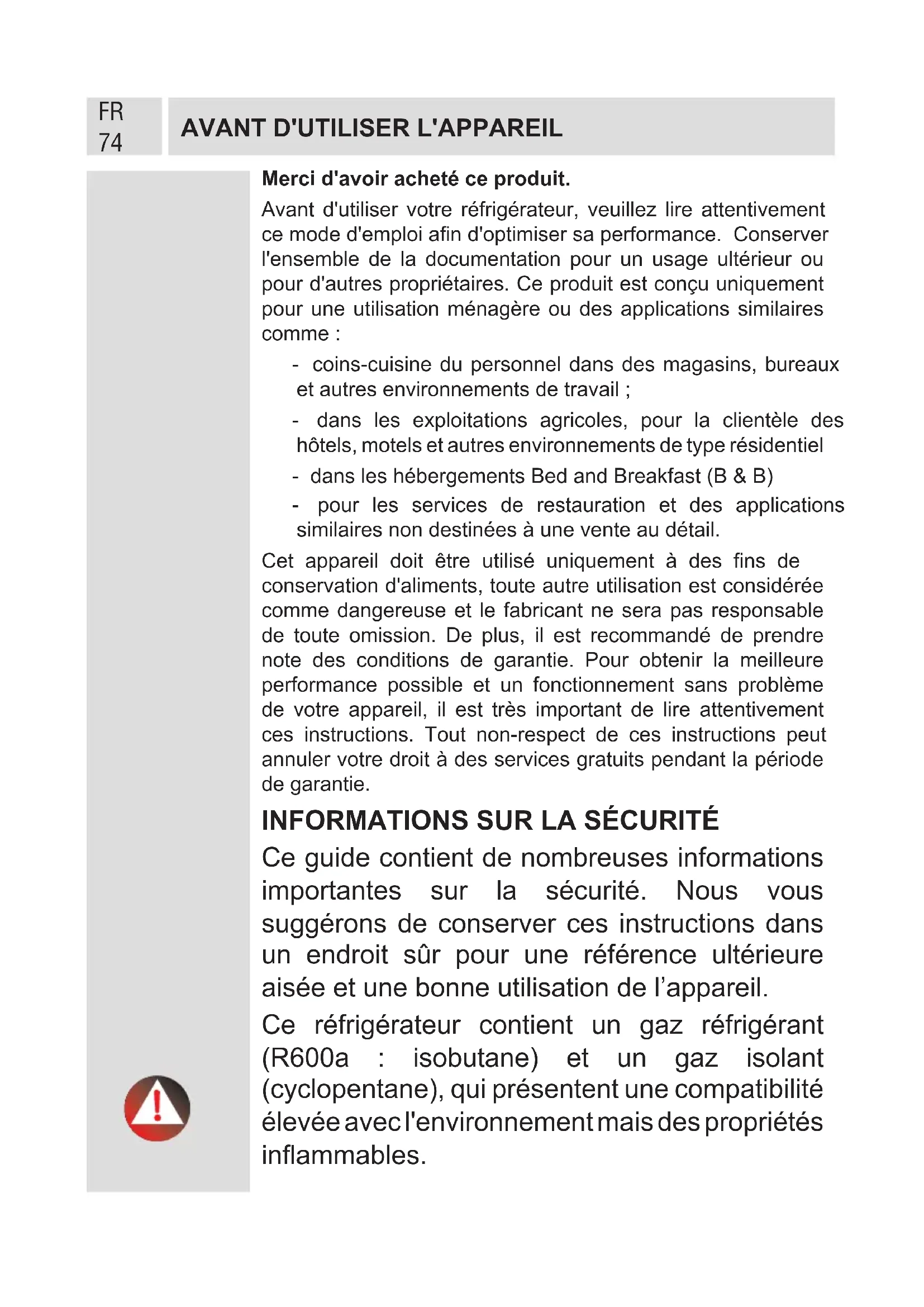 Ce guide contient de nombreuses informations importantes sur la sécurité. Nous vous suggérons de conserver ces instructions dans un endroit sûr pour une référence ultérieure aisée et une bonne utilisation de l’appareil. Ce réfrigérateur contient un gaz réfrigérant (R600a : isobutane) et un gaz isolant (cyclopentane), qui présentent une compatibilité élevée avec l'environnement mais des propriétés inammables.