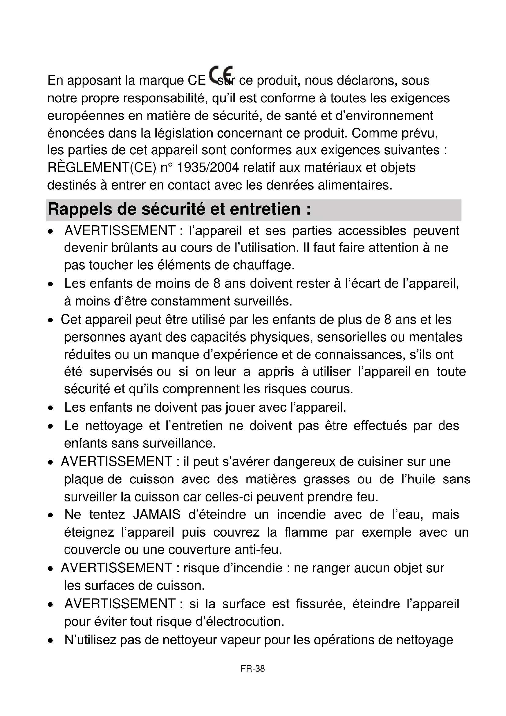 86,4 179,2 177,3 181,0FR-38 En apposant la marque CE sur ce produit, nous déclarons, sous notre propre responsabilité, qu’il est conforme à toutes les exigences européennes en matière de sécurité, de santé et d’environnement énoncées dans la législation concernant ce produit. Comme prévu, les parties de cet appareil sont conformes aux exigences suivantes : RÈGLEMENT(CE) n° 1935/2004 relatif aux matériaux et objets destinés à entrer en contact avec les denrées alimentaires. Rappels de sécurité et entretien :