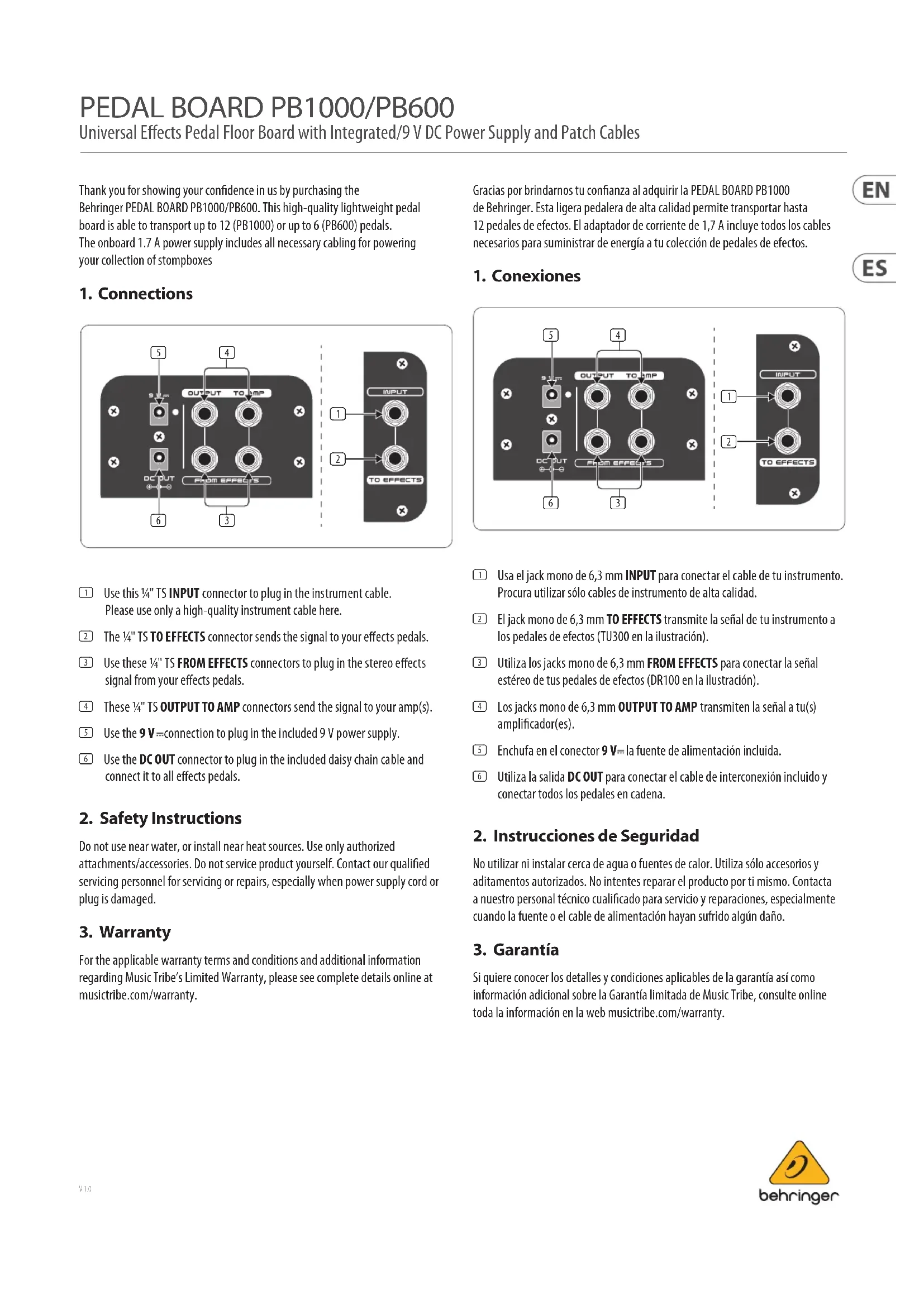 Universal Eects Pedal Floor Board with Integrated/9 V DC Power Supply and Patch Cables Merci de la conance que tu nous as prouvée en achetant le PEDAL BOARD PB1000 Behringer. Cette mallette compacte de haute qualité pour pédales d’eet permet de transporter et de pré-congurer jusqu’à 12 pédales. Le bloc d’alimentation intégré de 1,7 A est accompagné du câble de chaînage nécessaire pour alimenter ta collection de pédales d’eet.