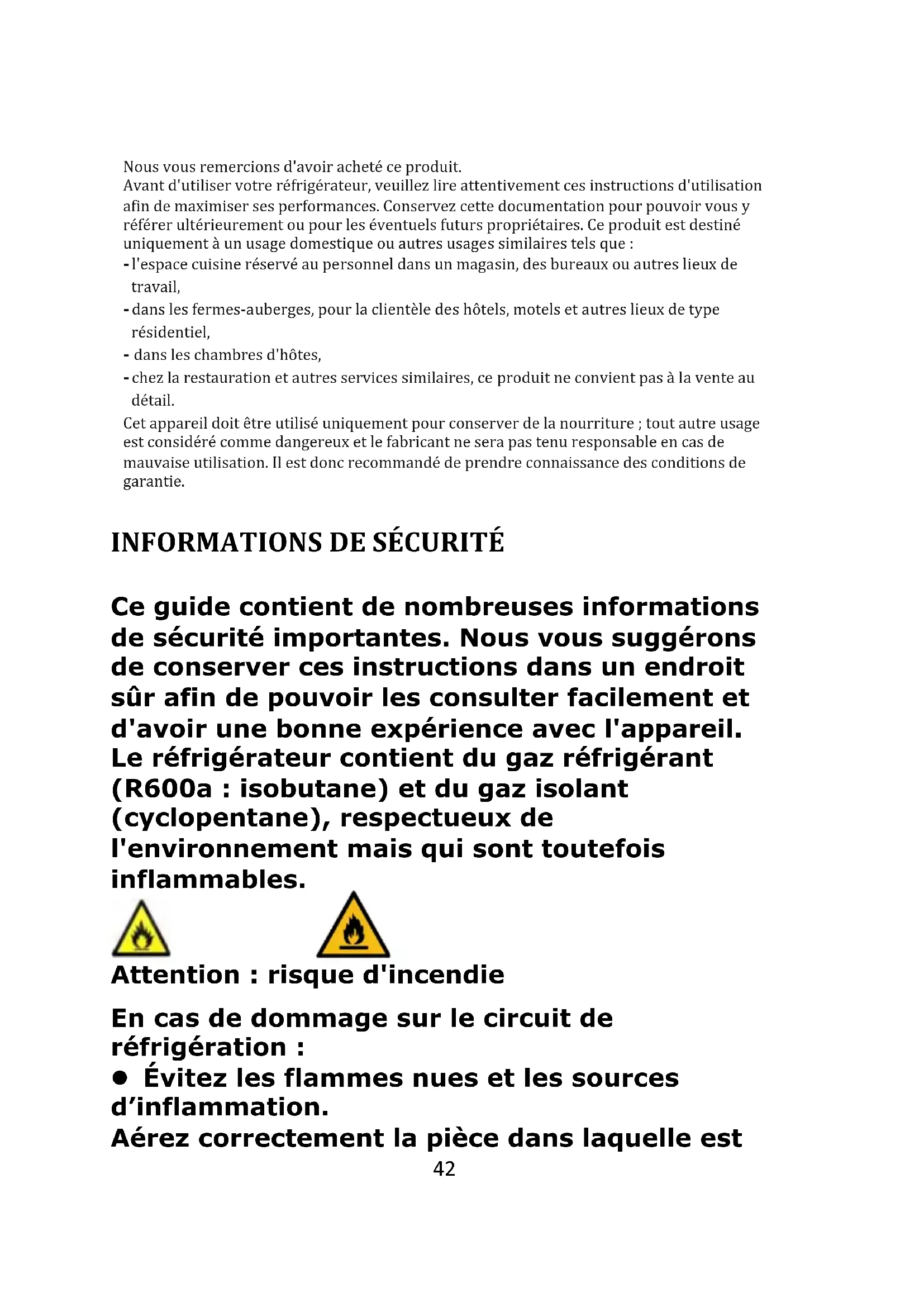 Ce guide contient de nombreuses informations de sécurité importantes. Nous vous suggérons de conserver ces instructions dans un endroit sûr afin de pouvoir les consulter facilement et d'avoir une bonne expérience avec l'appareil. Le réfrigérateur contient du gaz réfrigérant (R600a : isobutane) et du gaz isolant (cyclopentane), respectueux de l'environnement mais qui sont toutefois inflammables. Attention : risque d'incendie En cas de dommage sur le circuit de réfrigération : Évitez les flammes nues et les sources d’inflammation. Aérez correctement la pièce dans laquelle est43 installé l’appareil AVERTISSEMENT !