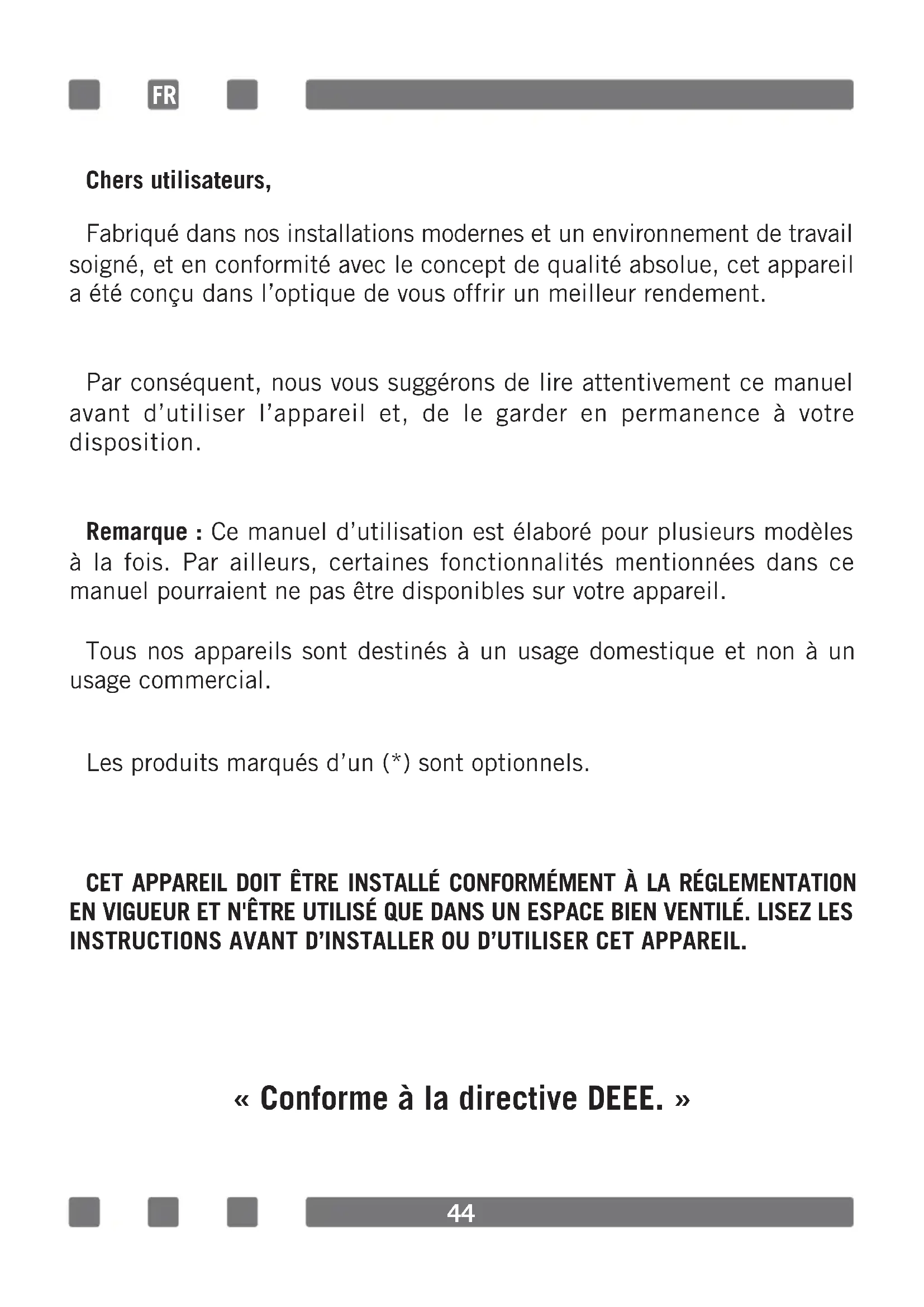 GB43 ENVIRONMENTALLY-FRIENDLY DISPOSAL Dispose of packaging in an environmentally-friendly manner. This appliance is labelled in accordance with European Directive 2012/19/EU concerning used electrical and electronic appliances (waste electrical and electronic equipment - WEEE). The guideline determines the frame work for the return and recycling of used appliances as applicable throughout to the EU. PACKAGE INFORMATION Packaging materials of the product are manufactured from recyclable materials in accordance with our National Environment Regulations. Do not dispose of the packaging materials together with the domestic or other wastes. Take them to the packaging material collection points designated by the local authorities.44 Chers utilisateurs, Fabriqué dans nos installations modernes et un environnement de travail soigné, et en conformité avec le concept de qualité absolue, cet appareil a été conçu dans l’optique de vous offrir un meilleur rendement. Par conséquent, nous vous suggérons de lire attentivement ce manuel avant d’utiliser l’appareil et, de le garder en permanence à votre disposition. Remarque : Ce manuel d’utilisation est élaboré pour plusieurs modèles à la fois. Par ailleurs, certaines fonctionnalités mentionnées dans ce manuel pourraient ne pas être disponibles sur votre appareil. Tous nos appareils sont destinés à un usage domestique et non à un usage commercial. Les produits marqués d’un (*) sont optionnels. CET APPAREIL DOIT ÊTRE INSTALLÉ CONFORMÉMENT À LA RÉGLEMENTATION EN VIGUEUR ET N'ÊTRE UTILISÉ QUE DANS UN ESPACE BIEN VENTILÉ. LISEZ LES INSTRUCTIONS AVANT D’INSTALLER OU D’UTILISER CET APPAREIL. « Conforme à la directive DEEE. » FR45 Table des matieres Avertissements importants 46 Connexion electrique 59 Connexion de gaz 60 Présentation de l'appareil 65 Accessoires 66 Caractéristiques techniques de votre four 67 Installation de votre four 70 Illustration d'arrimage de chaîne 72 Panneau de commande 72 Utilisation de la section de four 73 Utilisation du grill 74 Utilisation de la rôtissoire pour poulet 74 Utilisation de la table de cuisson 75 Types de programmes 77 Tableau de cuisson 78 Maintenance et nettoyage 79 Assemblage de la porte du four 80 Nettoyage et maintenance de la vitre avant du four 81 Parois catalytiques 81 Positions de la grille 82 Remplacement de l'ampoule du four 82 Utilisation de la feuille de déecteur de grill 83 Dépannage 84 Règles de manutention 86 Recommandations pour économiser l’énergie 86 Mise au rebut respectueuse de l'environnement 87 Informations relatives à l'emballage 8746 AVERTISSEMENTS IMPORTANTS