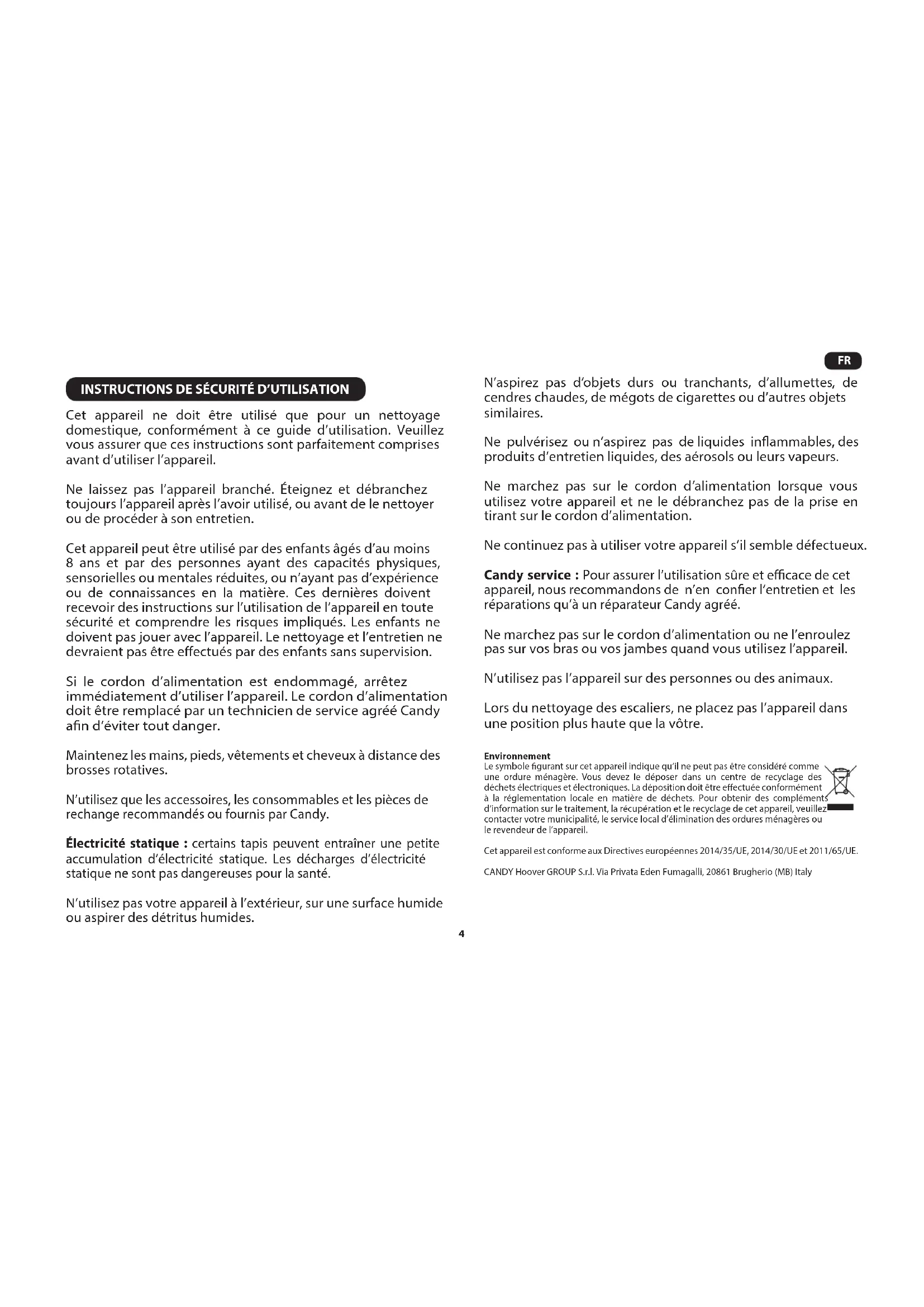 Cet appareil ne doit être utilisé que pour un nettoyage domestique, conformément à ce guide d’utilisation. Veuillez vous assurer que ces instructions sont parfaitement comprises avant d’utiliser l’appareil. Ne laissez pas l’appareil branché. Éteignez et débranchez toujours l’appareil après l’avoir utilisé, ou avant de le nettoyer ou de procéder à son entretien. Cet appareil peut être utilisé par des enfants âgés d’au moins 8 ans et par des personnes ayant des capacités physiques, sensorielles ou mentales réduites, ou n’ayant pas d’expérience ou de connaissances en la matière. Ces dernières doivent recevoir des instructions sur l’utilisation de l’appareil en toute sécurité et comprendre les risques impliqués. Les enfants ne doivent pas jouer avec l’appareil. Le nettoyage et l’entretien ne devraient pas être eectués par des enfants sans supervision. Si le cordon d’alimentation est endommagé, arrêtez immédiatement d’utiliser l’appareil. Le cordon d’alimentation doit être remplacé par un technicien de service agréé Candy an d’éviter tout danger. Maintenez les mains, pieds, vêtements et cheveux à distance des brosses rotatives. N’utilisez que les accessoires, les consommables et les pièces de rechange recommandés ou fournis par Candy. Électricité statique : certains tapis peuvent entraîner une petite accumulation d’électricité statique. Les décharges d’électricité statique ne sont pas dangereuses pour la santé. N’utilisez pas votre appareil à l’extérieur, sur une surface humide ou aspirer des détritus humides. N’aspirez pas d’objets durs ou tranchants, d’allumettes, de cendres chaudes, de mégots de cigarettes ou d’autres objets similaires. Ne pulvérisez ou n’aspirez pas de liquides inammables, des produits d’entretien liquides, des aérosols ou leurs vapeurs. Ne marchez pas sur le cordon d’alimentation lorsque vous utilisez votre appareil et ne le débranchez pas de la prise en tirant sur le cordon d’alimentation. Ne continuez pas à utiliser votre appareil s’il semble défectueux. Candy service : Pour assurer l’utilisation sûre et ecace de cet appareil, nous recommandons de n’en coner l’entretien et les réparations qu’à un réparateur Candy agréé. Ne marchez pas sur le cordon d’alimentation ou ne l’enroulez pas sur vos bras ou vos jambes quand vous utilisez l’appareil. N’utilisez pas l’appareil sur des personnes ou des animaux. Lors du nettoyage des escaliers, ne placez pas l’appareil dans une position plus haute que la vôtre. Environnement Le symbole gurant sur cet appareil indique qu’il ne peut pas être considéré comme une ordure ménagère. Vous devez le déposer dans un centre de recyclage des déchets électriques et électroniques. La déposition doit être eectuée conformément à la réglementation locale en matière de déchets. Pour obtenir des compléments d’information sur le traitement, la récupération et le recyclage de cet appareil, veuillez contacter votre municipalité, le service local d’élimination des ordures ménagères ou le revendeur de l’appareil. Cet appareil est conforme aux Directives européennes 2014/35/UE, 2014/30/UE et 2011/65/UE. CANDY Hoover GROUP S.r.l. Via Privata Eden Fumagalli, 20861 Brugherio (MB) Italy5