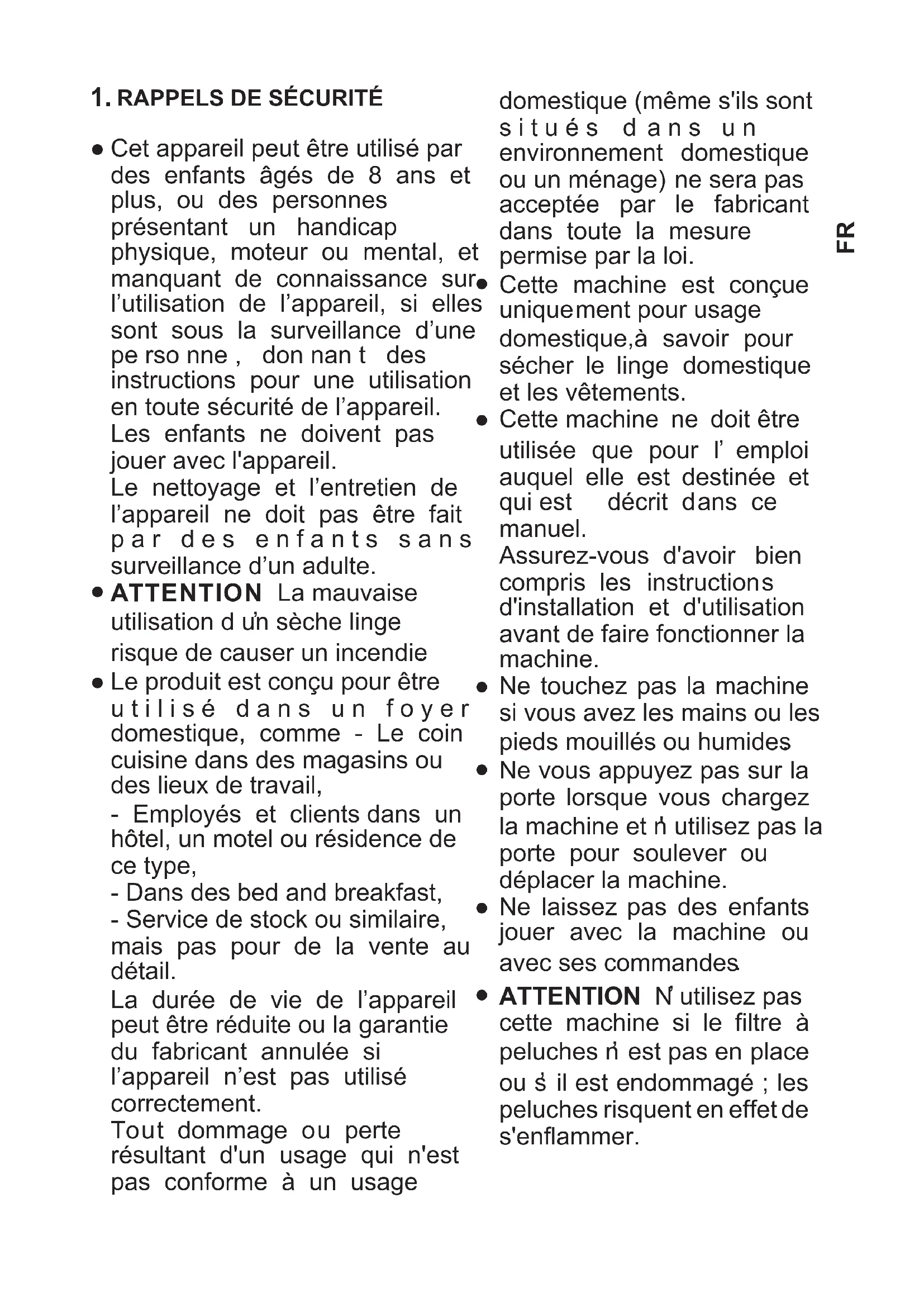 Cet appareil peut être utilisé par des enfants âgés de 8 ans et plus, ou des personnes présentant un handicap physique, moteur ou mental, et manquant de connaissance sur l’utilisation de l’appareil, si elles sont sous la surveillance d’une pe rso nne , don nan t des instructions pour une utilisation en toute sécurité de l’appareil. Les enfants ne doivent pas jouer avec l'appareil. Le nettoyage et l’entretien de l’appareil ne doit pas être fait p a r d e s e n f a n t s s a n s surveillance d’un adulte. La mauvaise utilisation d un sèche linge risque de causer un incendie Le produit est conçu pour être u t i l i s é d a n s u n f o y e r domestique, comme - Le coin cuisine dans des magasins ou des lieux de travail, - Employés et clients dans un hôtel, un motel ou résidence de ce type, - Dans des bed and breakfast, - Service de stock ou similaire, mais pas pour de la vente au détail. La durée de vie de l’appareil peut être réduite ou la garantie du fabricant annulée si l’appareil n’est pas utilisé correctement. Tout dommage ou perte résultant d'un usage qui n'est pas conforme à un usage ATTENTION