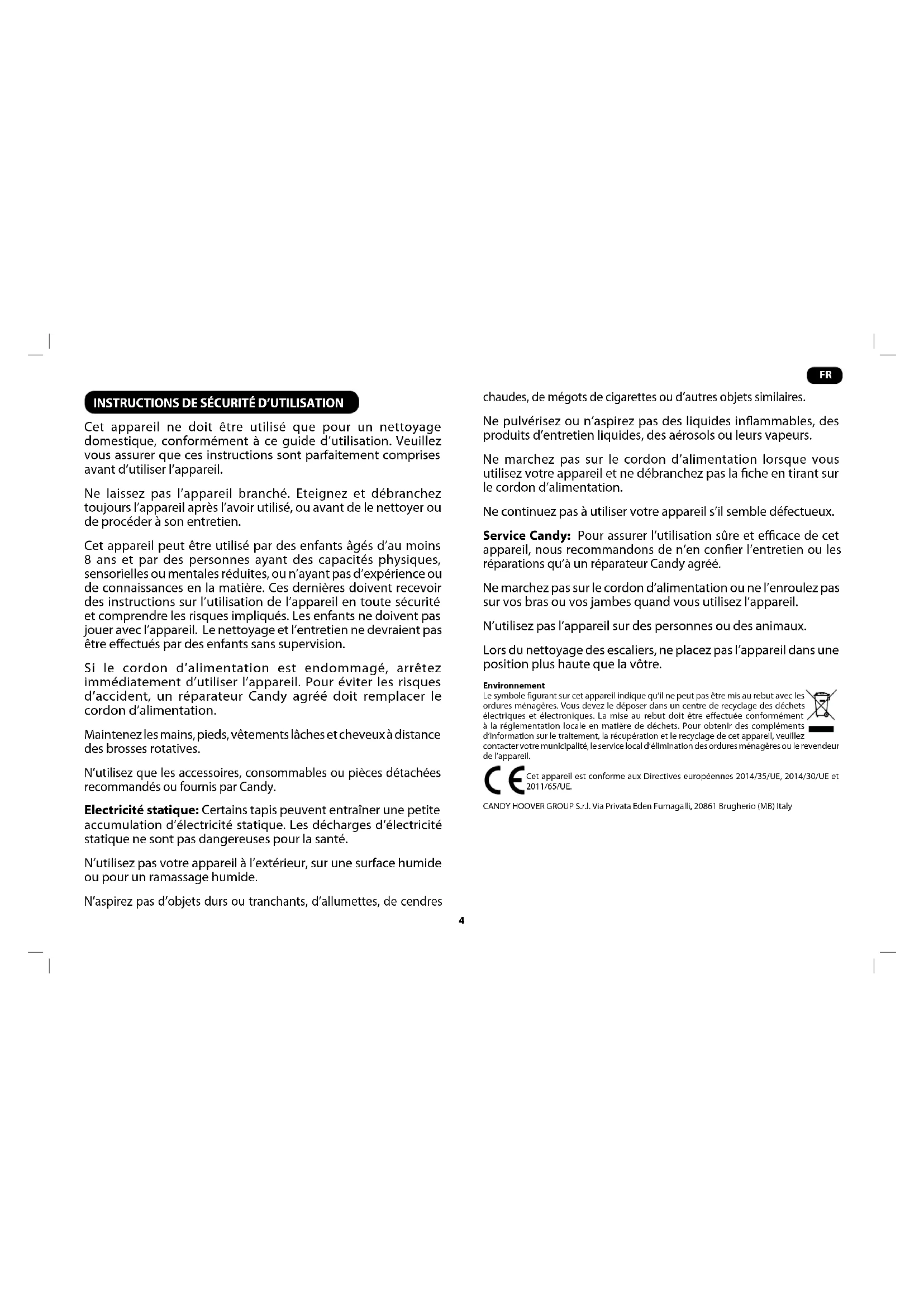 Cet appareil ne doit être utilisé que pour un nettoyage domestique, conformément à ce guide d’utilisation. Veuillez vous assurer que ces instructions sont parfaitement comprises avant d’utiliser l’appareil. Ne laissez pas l’appareil branché. Eteignez et débranchez toujours l’appareil après l’avoir utilisé, ou avant de le nettoyer ou de procéder à son entretien. Cet appareil peut être utilisé par des enfants âgés d’au moins 8 ans et par des personnes ayant des capacités physiques, sensorielles ou mentales réduites, ou n’ayant pas d’expérience ou de connaissances en la matière. Ces dernières doivent recevoir des instructions sur l’utilisation de l’appareil en toute sécurité et comprendre les risques impliqués. Les enfants ne doivent pas jouer avec l’appareil. Le nettoyage et l’entretien ne devraient pas être eectués par des enfants sans supervision. Si le cordon d’alimentation est endommagé, arrêtez immédiatement d’utiliser l’appareil. Pour éviter les risques d’accident, un réparateur Candy agréé doit remplacer le cordon d’alimentation. Maintenez les mains, pieds, vêtements lâches et cheveux à distance des brosses rotatives. N’utilisez que les accessoires, consommables ou pièces détachées recommandés ou fournis par Candy. Electricité statique: Certains tapis peuvent entraîner une petite accumulation d’électricité statique. Les décharges d’électricité statique ne sont pas dangereuses pour la santé. N’utilisez pas votre appareil à l’extérieur, sur une surface humide ou pour un ramassage humide. N’aspirez pas d’objets durs ou tranchants, d’allumettes, de cendres chaudes, de mégots de cigarettes ou d’autres objets similaires. Ne pulvérisez ou n’aspirez pas des liquides inammables, des produits d’entretien liquides, des aérosols ou leurs vapeurs. Ne marchez pas sur le cordon d’alimentation lorsque vous utilisez votre appareil et ne débranchez pas la che en tirant sur le cordon d’alimentation. Ne continuez pas à utiliser votre appareil s’il semble défectueux. Service Candy: Pour assurer l’utilisation sûre et ecace de cet appareil, nous recommandons de n’en coner l’entretien ou les réparations qu’à un réparateur Candy agréé. Ne marchez pas sur le cordon d’alimentation ou ne l’enroulez pas sur vos bras ou vos jambes quand vous utilisez l’appareil. N’utilisez pas l’appareil sur des personnes ou des animaux. Lors du nettoyage des escaliers, ne placez pas l’appareil dans une position plus haute que la vôtre. Environnement Le symbole gurant sur cet appareil indique qu’il ne peut pas être mis au rebut avec les ordures ménagères. Vous devez le déposer dans un centre de recyclage des déchets électriques et électroniques. La mise au rebut doit être effectuée conformément à la réglementation locale en matière de déchets. Pour obtenir des compléments d’information sur le traitement, la récupération et le recyclage de cet appareil, veuillez contacter votre municipalité, le service local d’élimination des ordures ménagères ou le revendeur de l’appareil. Cet appareil est conforme aux Directives européennes 2014/35/UE, 2014/30/UE et 2011/65/UE. CANDY HOOVER GROUP S.r.l. Via Privata Eden Fumagalli, 20861 Brugherio (MB) Italy5
