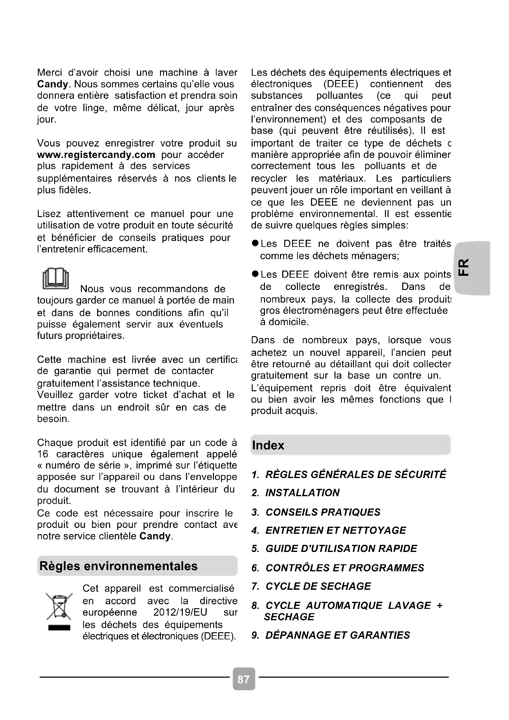 Merci d’avoir choisi une machine à laver Candy. Nous sommes certains qu’elle vous donnera entière satisfaction et prendra soin de votre linge, même délicat, jour après jour. Vous pouvez enregistrer votre produit sur www.registercandy.com pour accéder plus rapidement à des services supplémentaires réservés à nos clients les plus fidèles. Lisez attentivement ce manuel pour une utilisation de votre produit en toute sécurité et bénéficier de conseils pratiques pour l’entretenir efficacement. Nous vous recommandons de toujours garder ce manuel à portée de main et dans de bonnes conditions afin qu’il puisse également servir aux éventuels futurs propriétaires. Cette machine est livrée avec un certificat de garantie qui permet de contacter gratuitement l’assistance technique. Veuillez garder votre ticket d’achat et le mettre dans un endroit sûr en cas de besoin. Chaque produit est identifié par un code à 16 caractères unique également appelé « numéro de série », imprimé sur l’étiquette apposée sur l’appareil ou dans l’enveloppe du document se trouvant à l’intérieur du produit. Ce code est nécessaire pour inscrire le produit ou bien pour prendre contact avec notre service clientèle Candy.