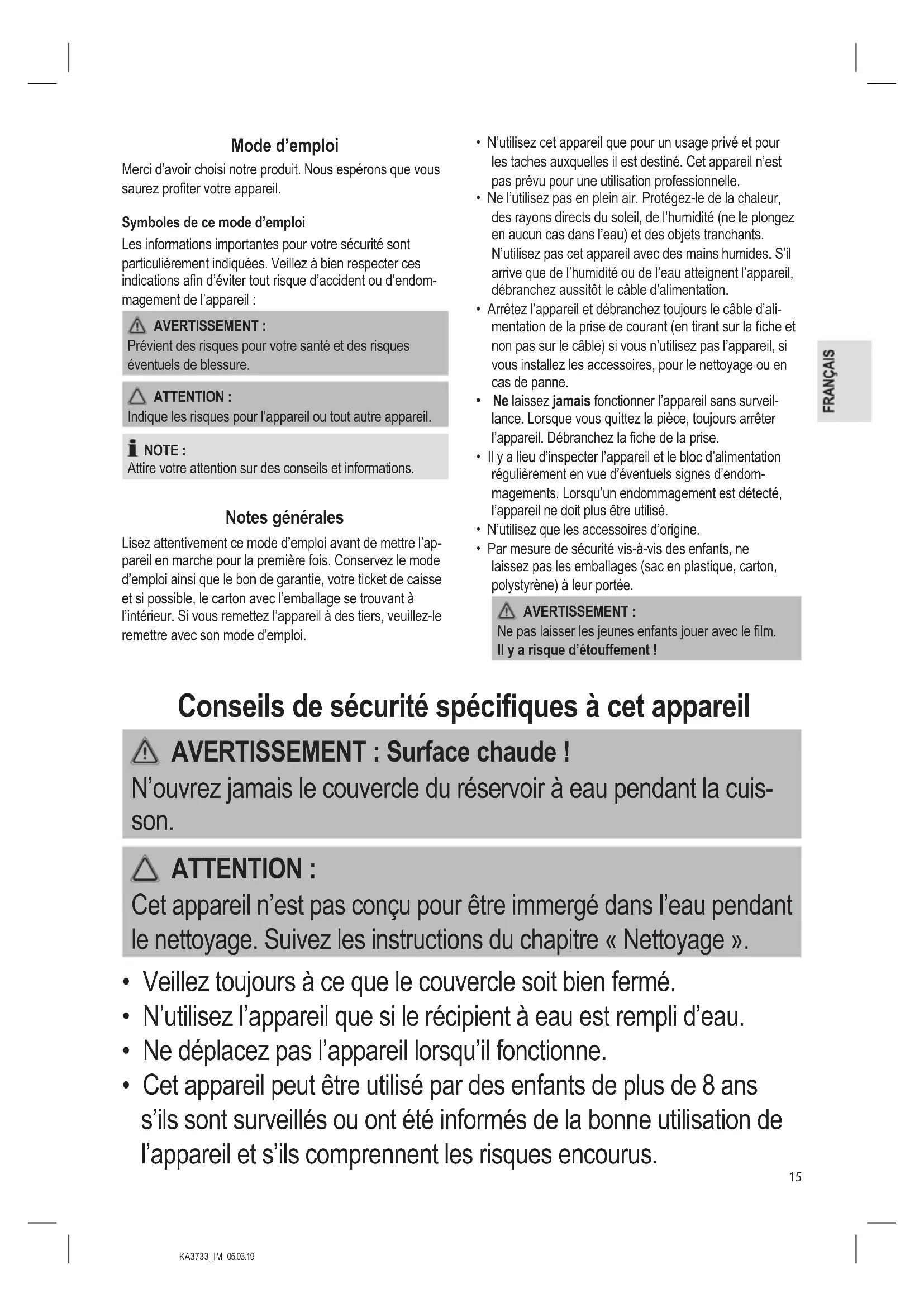 - Cet appareil peut être utilisé par des enfants de plus de 8 ans s’ils sont surveillés ou ont été informés de la bonne utilisation de l’appareil et s’ils comprennent les risques encourus.KA3733_IM 05.03.19