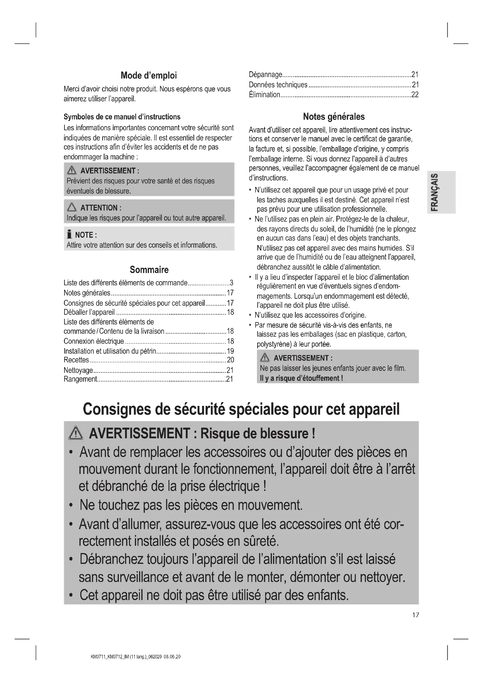 - Gardez toujours l’appareil hors de la portée des enfants dans un endroit sec et bien ventilé. Dépannage Problème Cause possible Solution L’appareil ne s’allume pas ou arrête de fonctionner. L’appareil n’est pas branché. Vériez la prise avec un autre appareil. Branchez correc- tement le cordon d’alimentation. Vériez le fusible. Le bras pivotant n’est pas bloqué dans sa position la plus basse. Un interrupteur de sécurité empêche le fonctionnement. Abaissez simultané- ment la manette et le bras pivotant jusqu’à ce qu’il se bloque. L’appareil est défec- tueux. Contactez notre centre de service ou un spécialiste. Données techniques Modèle : ...................................................KM 3711 / KM 3712 Alimentation : ...........................................220 - 240 V~, 50 Hz Puissance électrique : .................................................1100 W Classe de protection : .......................................................... Poids net : ............................................................env. 3,85 kg Nous nous réservons le droit d’apporter des modications techniques ainsi que des modications de conception dans le cadre du développement continu de nos produits. Cet appareil a été contrôlé d’après toutes les directives européennes actuelles applicables, comme par exemple concernant la compatibilité électromagnétique et la basse tension. Cet appareil a été fabriqué en respect des régle- mentations techniques de sécurité les plus récentes.KM3711_KM3712_IM (11 lang.)_062020 08.06.20