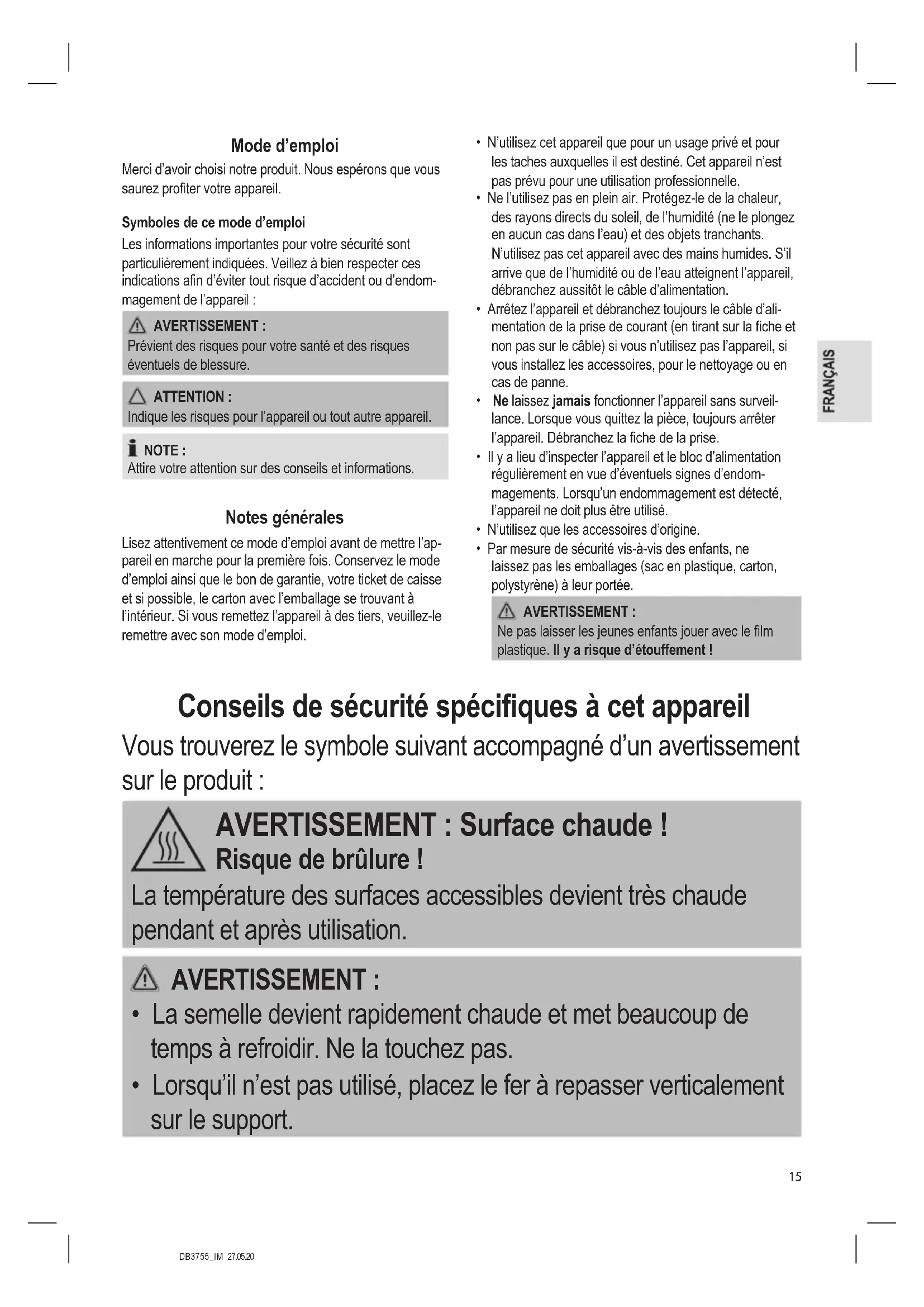 Le fer a repasser éjecte une grande quantité de vapeur chaude. Il y a des risques de brûlure ! NOTE :