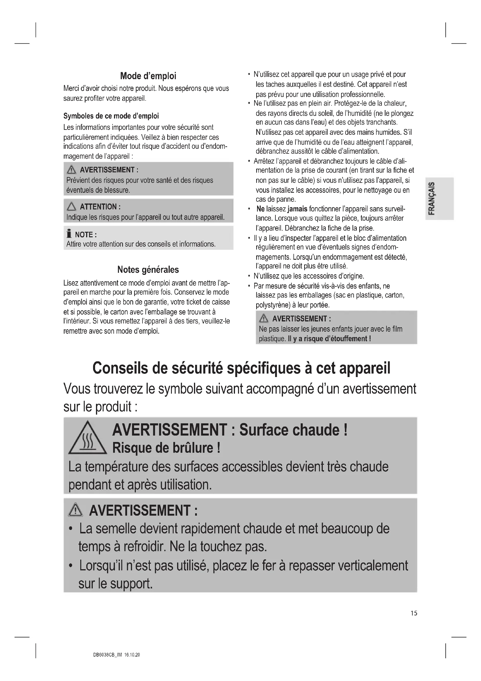 Le fer a repasser éjecte une grande quantité de vapeur chaude. Il y a des risques de brûlure ! NOTE :