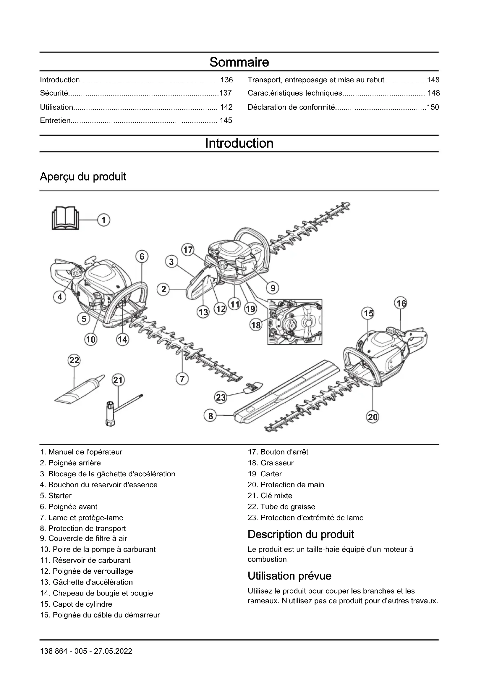 Description du produit Le produit est un taille-haie équipé d'un moteur à combustion. Utilisation prévue Utilisez le produit pour couper les branches et les rameaux. N'utilisez pas ce produit pour d'autres travaux. 136 864 - 005 - 27.05.2022Symboles concernant le produit Arrêtez la machine. Soyez prudent et utilisez le produit correctement. Ce produit peut causer des blessures graves, voire mortelles, à l'opérateur ou à d'autres personnes. Lisez attentivement le manuel d'utilisation et assurez-vous de bien comprendre les instructions avant utilisation. Utilisez des protège-oreilles et des protections pour les yeux homologués. Utilisez des gants de protection homologués. Utilisez des bottes antidérapantes robustes. Vis de réglage du ralenti. Pointeau de vitesse élevée. Pointeau de vitesse lente. Émissions sonores dans l'environnement selon la directive européenne 2000/14/CE et la législation de la Nouvelle-Galles du Sud « Protection of the Environment Operations (Noise Control) Regulation 2017 ». Les données relatives aux émissions sonores figurent sur l'étiquette de la machine et dans le chapitre Caractéristiques techniques. Le produit est conforme aux directives CE en vigueur. Ce produit est conforme aux directives applicables en vigueur au Royaume-Uni. yyyywwxxxx La plaque signalétique indique le nu- méro de série. aaaa désigne l'année de production et ww désigne la se- maine de production. Remarque: les autres symboles/autocollants présents sur le produit concernent des exigences de certification spécifiques à certains marchés. Émissions Euro V