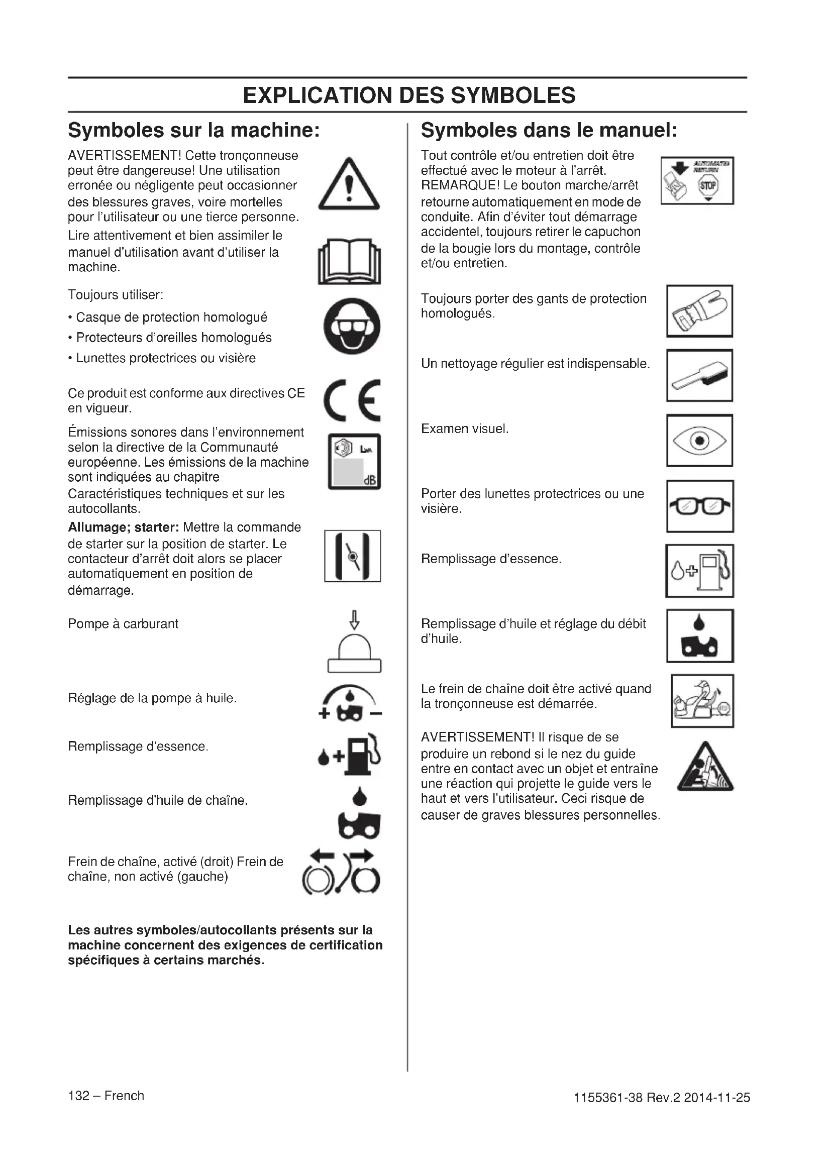 - Lunettes protectrices ou visière Ce produit est conforme aux directives CE en vigueur. Émissions sonores dans l’environnement selon la directive de la Communauté européenne. Les émissions de la machine sont indiquées au chapitre Caractéristiques techniques et sur les autocollants. Allumage; starter: Mettre la commande de starter sur la position de starter. Le contacteur d’arrêt doit alors se placer automatiquement en position de démarrage. Pompe à carburant Réglage de la pompe à huile. Remplissage d’essence. Remplissage d'huile de chaîne. Frein de chaîne, activé (droit) Frein de chaîne, non activé (gauche) Les autres symboles/autocollants présents sur la machine concernent des exigences de certification spécifiques à certains marchés. Symboles dans le manuel: Tout contrôle et/ou entretien doit être effectué avec le moteur à l’arrêt. REMARQUE! Le bouton marche/arrêt retourne automatiquement en mode de conduite. Afin d’éviter tout démarrage accidentel, toujours retirer le capuchon de la bougie lors du montage, contrôle et/ou entretien. Toujours porter des gants de protection homologués. Un nettoyage régulier est indispensable. Examen visuel. Porter des lunettes protectrices ou une visière. Remplissage d’essence. Remplissage d’huile et réglage du débit d’huile. Le frein de chaîne doit être activé quand la tronçonneuse est démarrée. AVERTISSEMENT! Il risque de se produire un rebond si le nez du guide entre en contact avec un objet et entraîne une réaction qui projette le guide vers le haut et vers l’utilisateur. Ceci risque de causer de graves blessures personnelles.SOMMAIRE French – 133 1155361-38 Rev.2 2014-11-25 Sommaire