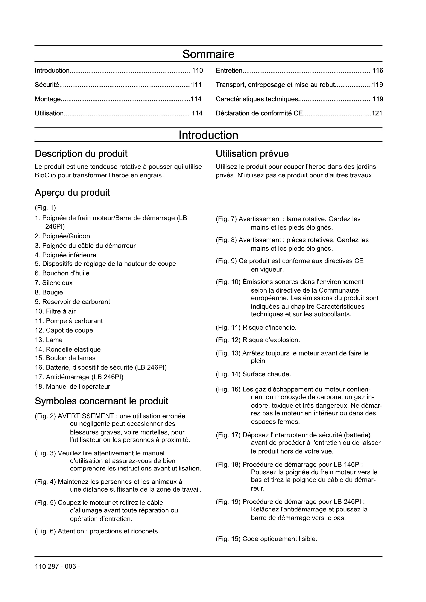 Symboles concernant le produit (Fig. 2) AVERTISSEMENT : une utilisation erronée ou négligente peut occasionner des blessures graves, voire mortelles, pour l'utilisateur ou les personnes à proximité. (Fig. 3) Veuillez lire attentivement le manuel d'utilisation et assurez-vous de bien comprendre les instructions avant utilisation. (Fig. 4) Maintenez les personnes et les animaux à une distance suffisante de la zone de travail. (Fig. 5) Coupez le moteur et retirez le câble d'allumage avant toute réparation ou opération d'entretien. (Fig. 6) Attention : projections et ricochets. (Fig. 7) Avertissement : lame rotative. Gardez les mains et les pieds éloignés. (Fig. 8) Avertissement : pièces rotatives. Gardez les mains et les pieds éloignés. (Fig. 9) Ce produit est conforme aux directives CE en vigueur. (Fig. 10) Émissions sonores dans l'environnement selon la directive de la Communauté européenne. Les émissions du produit sont indiquées au chapitre Caractéristiques techniques et sur les autocollants. (Fig. 11) Risque d'incendie. (Fig. 12) Risque d'explosion. (Fig. 13) Arrêtez toujours le moteur avant de faire le plein. (Fig. 14) Surface chaude. (Fig. 16) Les gaz d'échappement du moteur contien- nent du monoxyde de carbone, un gaz in- odore, toxique et très dangereux. Ne démar- rez pas le moteur en intérieur ou dans des espaces fermés. (Fig. 17) Déposez l'interrupteur de sécurité (batterie) avant de procéder à l'entretien ou de laisser le produit hors de votre vue. (Fig. 18) Procédure de démarrage pour LB 146P : Poussez la poignée du frein moteur vers le bas et tirez la poignée du câble du démar- reur. (Fig. 19) Procédure de démarrage pour LB 246PI : Relâchez l'antidémarrage et poussez la barre de démarrage vers le bas. (Fig. 15) Code optiquement lisible. 110 287 - 006 -Remarque: Les autres symboles/autocollants présents sur le produit concernent des exigences de certification spécifiques à d'autres zones commerciales. Émissions Euro V