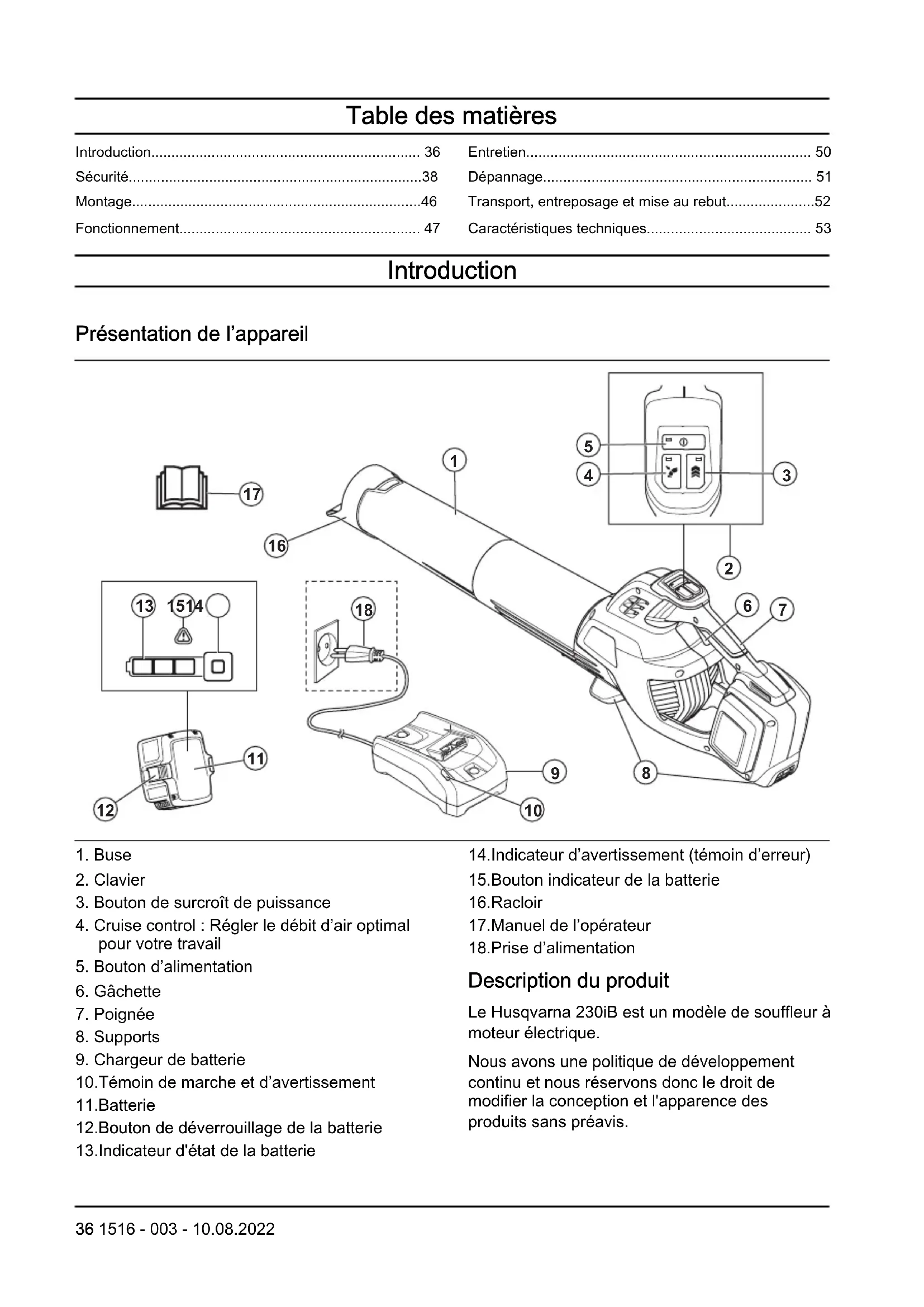 - Fixer le produit de façon sécuritaire pendant le transport. Mise au rebut de la batterie, du chargeur de batterie et du produit Le symbole ci-dessous signifie que le produit n’est pas un déchet domestique. Le recycler à la station de recyclage des équipements électriques et électroniques. Cela permet d’éviter des dommages à l’environnement et aux personnes. Communiquer avec les autorités locales, le service de déchets ménagers et votre concessionnaire pour obtenir de plus amples renseignements. Remarque: Le symbole sur le produit ou l’emballage du produit, indique: Caractéristiques techniques Caractéristiques techniques 230iB Moteur Type de moteur BLDC (sans balais) 36V Poids Poids sans batterie, kg/lb 2,5 / 5,5 Rendement de la roue à ailette (avec buse et tube du souffleur) Vitesse de l'air maximal, m/s/mi/h 60,8/136 Volume d'air maximal, m³/min/pi³/min 18,4 / 650 Force de soufflage, N 19,6 Les données sur le bruit et les vibrations sont déterminées sur la base de la vitesse nominale maximale. Batteries homologuées pour le produit Batterie BLi22 Type Lithium-ion 1516 - 003 - 10.08.2022 53Batterie BLi22 Capacité de la batterie, Ah 4,2 Tension nominale, V 36 Poids, lb/kg 2,9 /1,3 Chargeurs de batteries approuvés Chargeur de batterie QC250 40-C80 Tension d’entrée, V 100 à 240 100 à 240 Fréquence, Hz 50-60 50-60 Puissance, W 250 80 54 1516 - 003 - 10.08.20221516 - 003 - 10.08.2022 55Original instructions Instrucciones originales Instructions d’origine www.husqvarna.com 1142410-49 2022-08-15