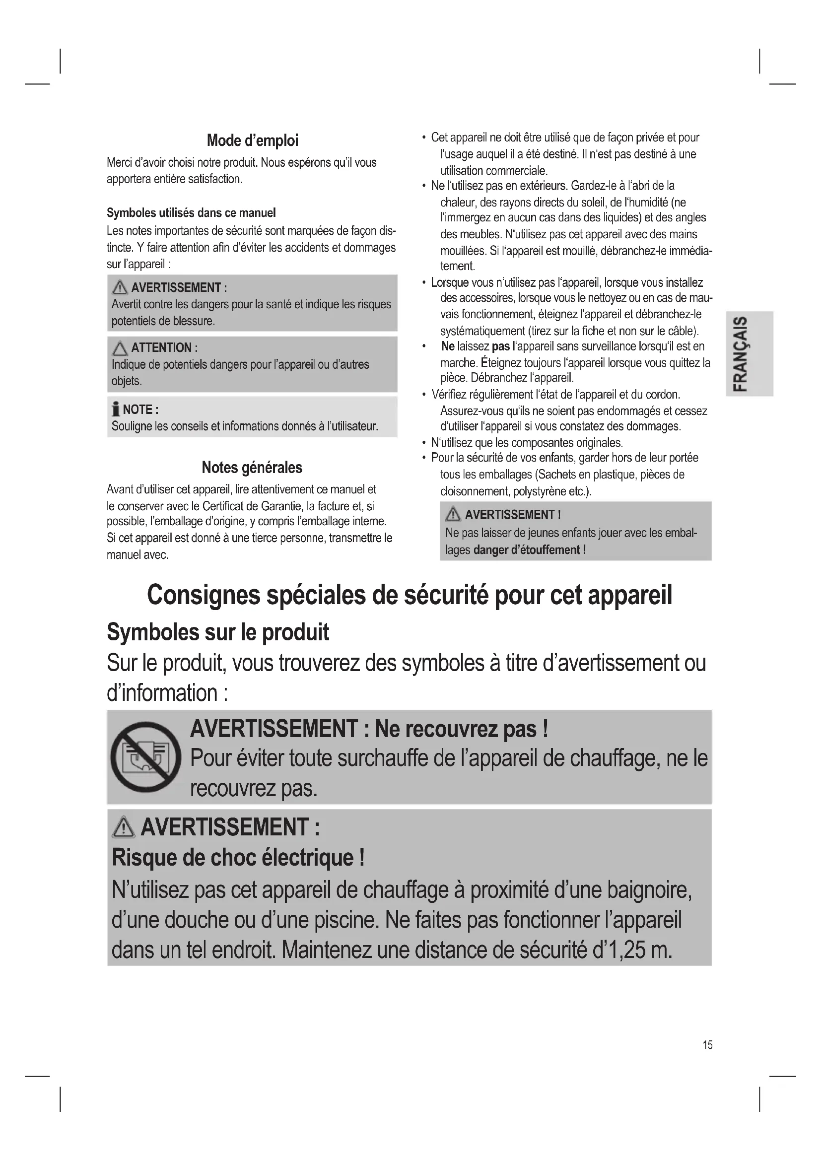 Risque de choc électrique ! N’utilisez pas cet appareil de chauffage à proximité d’une baignoire, d’une douche ou d’une piscine. Ne faites pas fonctionner l’appareil dans un tel endroit. Maintenez une distance de sécurité d’1,25 m.16