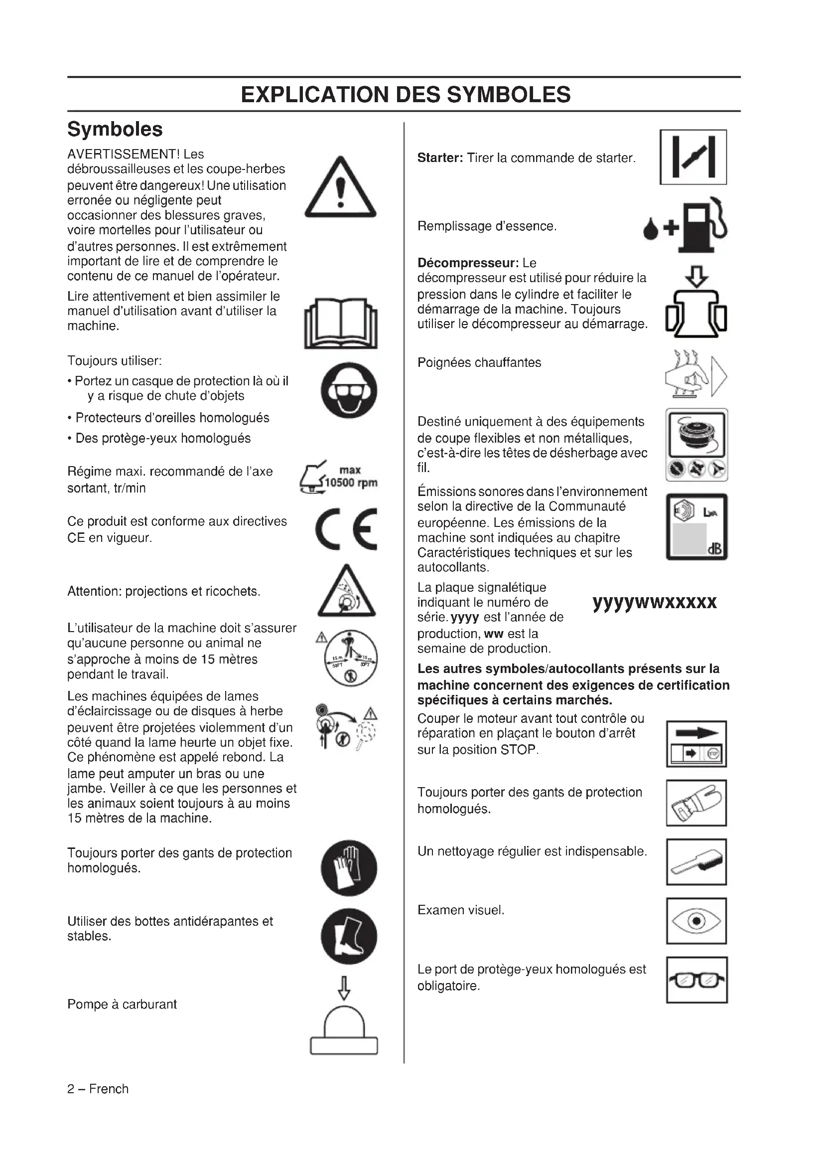 décompresseur est utilisé pour réduire la pression dans le cylindre et faciliter le démarrage de la machine. Toujours utiliser le décompresseur au démarrage. Poignées chauffantes Destiné uniquement à des équipements de coupe flexibles et non métalliques, c’est-à-dire les têtes de désherbage avec fil. Émissions sonores dans l’environnement selon la directive de la Communauté européenne. Les émissions de la machine sont indiquées au chapitre Caractéristiques techniques et sur les autocollants. La plaque signalétique indiquant le numéro de série. yyyy est l’année de production,