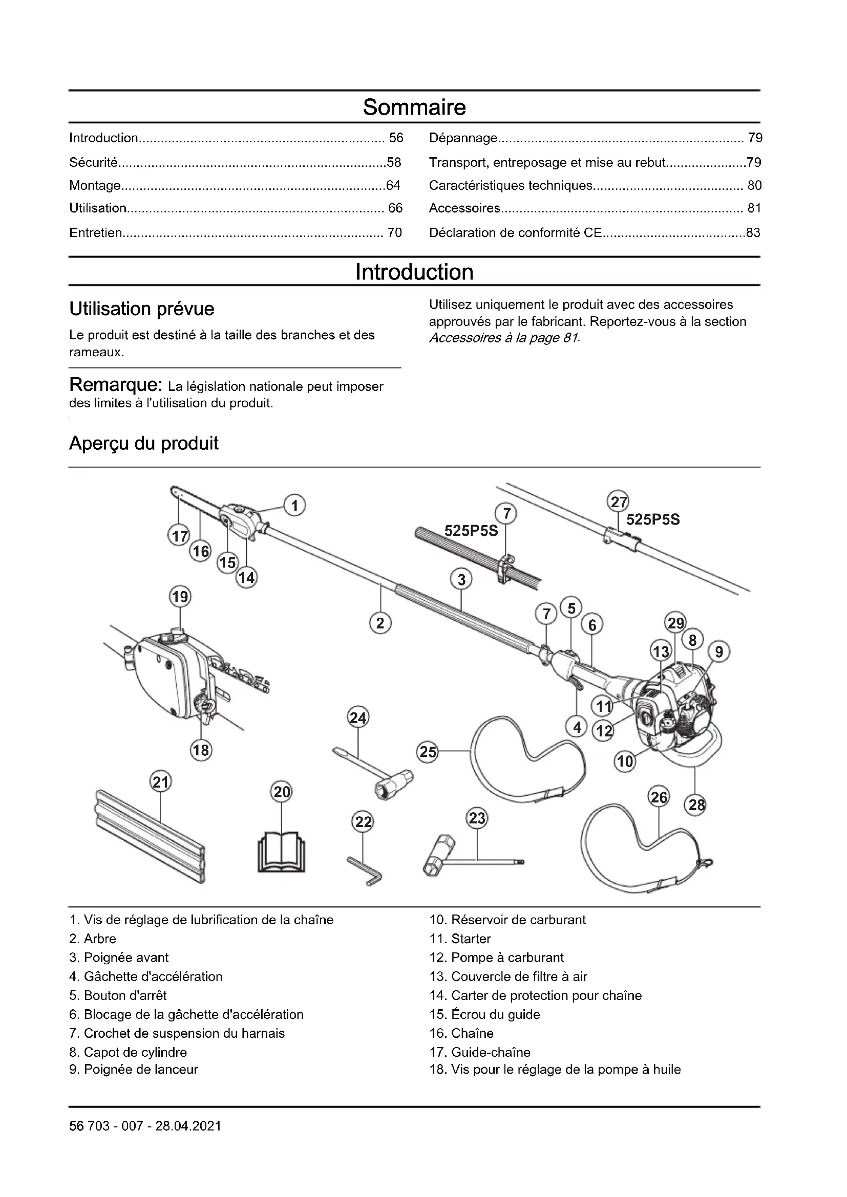 - Déclaration de conformité CE Introduction Utilisation prévue Le produit est destiné à la taille des branches et des rameaux. Remarque: La législation nationale peut imposer des limites à l'utilisation du produit. Utilisez uniquement le produit avec des accessoires approuvés par le fabricant. Reportez-vous à la section Accessoires à la page 81 p. 83