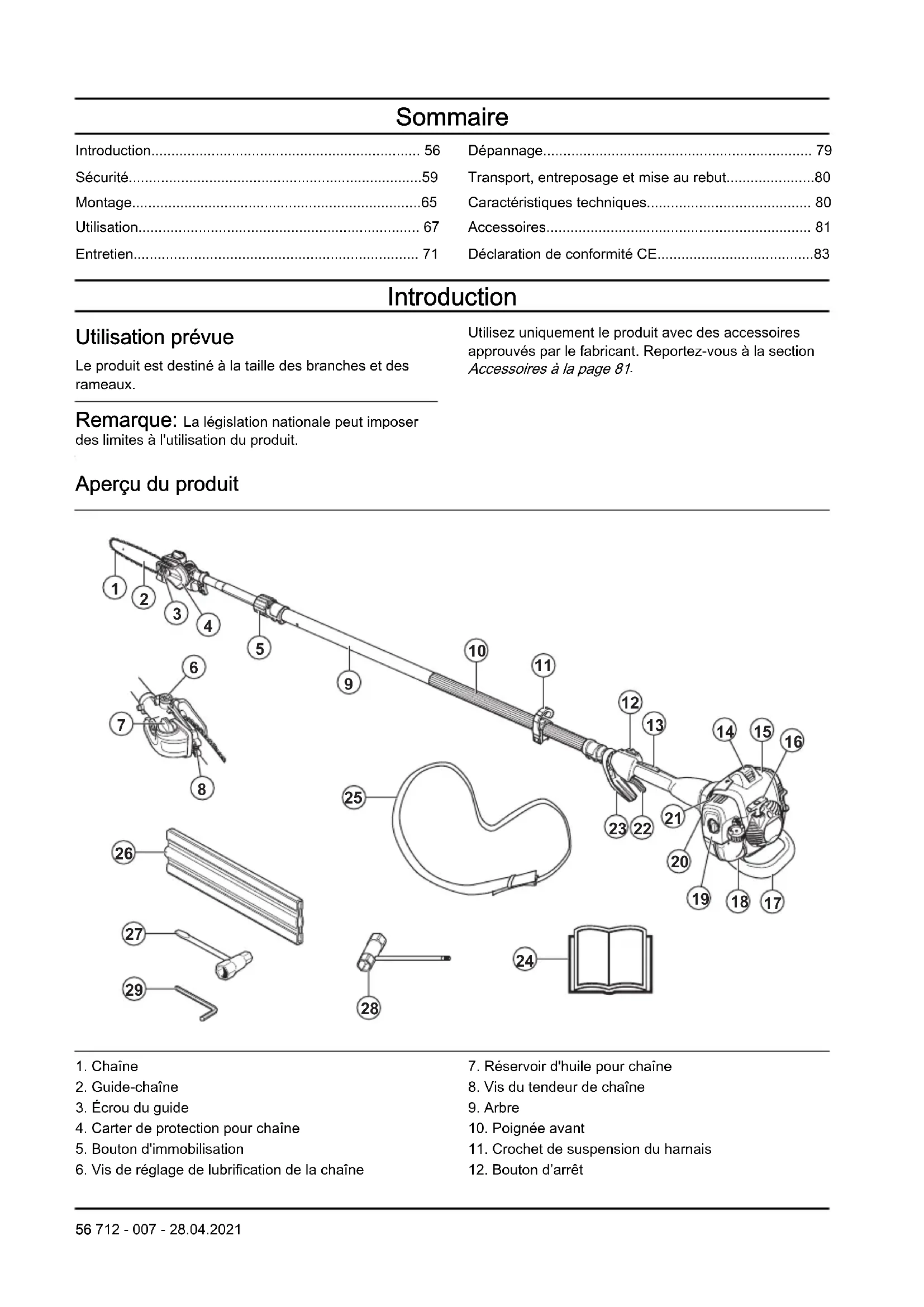 - Déclaration de conformité CE Introduction Utilisation prévue Le produit est destiné à la taille des branches et desrameaux. Remarque: La législation nationale peut imposer des limites à l'utilisation du produit.Utilisez uniquement le produit avec des accessoiresapprouvés par le fabricant. Reportez-vous à la section Accessoires à la page 81 p. 83