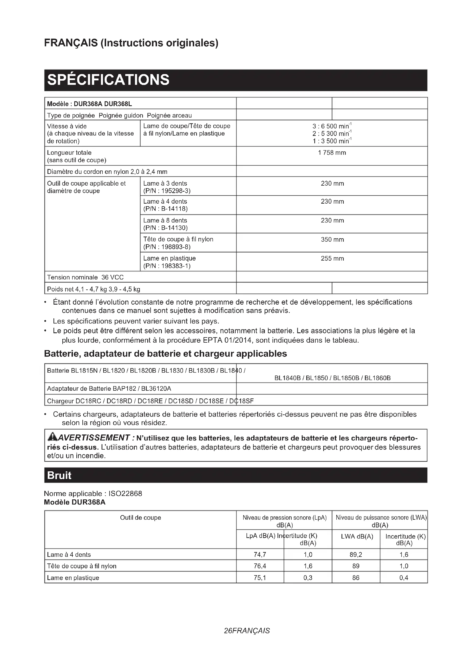 riés ci-dessus.L’utilisationd’autresbatteries,adaptateursdebatterieetchargeurspeutprovoquerdesblessures et/ou un incendie. Bruit Normeapplicable:ISO22868 Modèle DUR368A Outil de coupeNiveau de pression sonore (LpA)dB(A)Niveaudepuissancesonore(LWA)dB(A)LpA dB(A) Incertitude (K)dB(A)LWAdB(A) Incertitude (K)dB(A) Lame à 4 dents 74,7 1,0 89,2 1,6 Têtedecoupeàlnylon 76,4 1,6 89 1,0 Lameenplastique 75,1 0,3 86 0,427 FRANÇAIS Modèle DUR368L Outil de coupe Niveau de pression sonore (LpA) dB(A) Niveaudepuissancesonore(LWA) dB(A) LpA dB(A) Incertitude (K) dB(A) LWAdB(A) Incertitude (K) dB(A) Lame à 4 dents 74,7 1,0 89,2 1,6 Têtedecoupeàlnylon 76,4 1,6 89 1,0 Lameenplastique 75,1 0,3 86 0,4