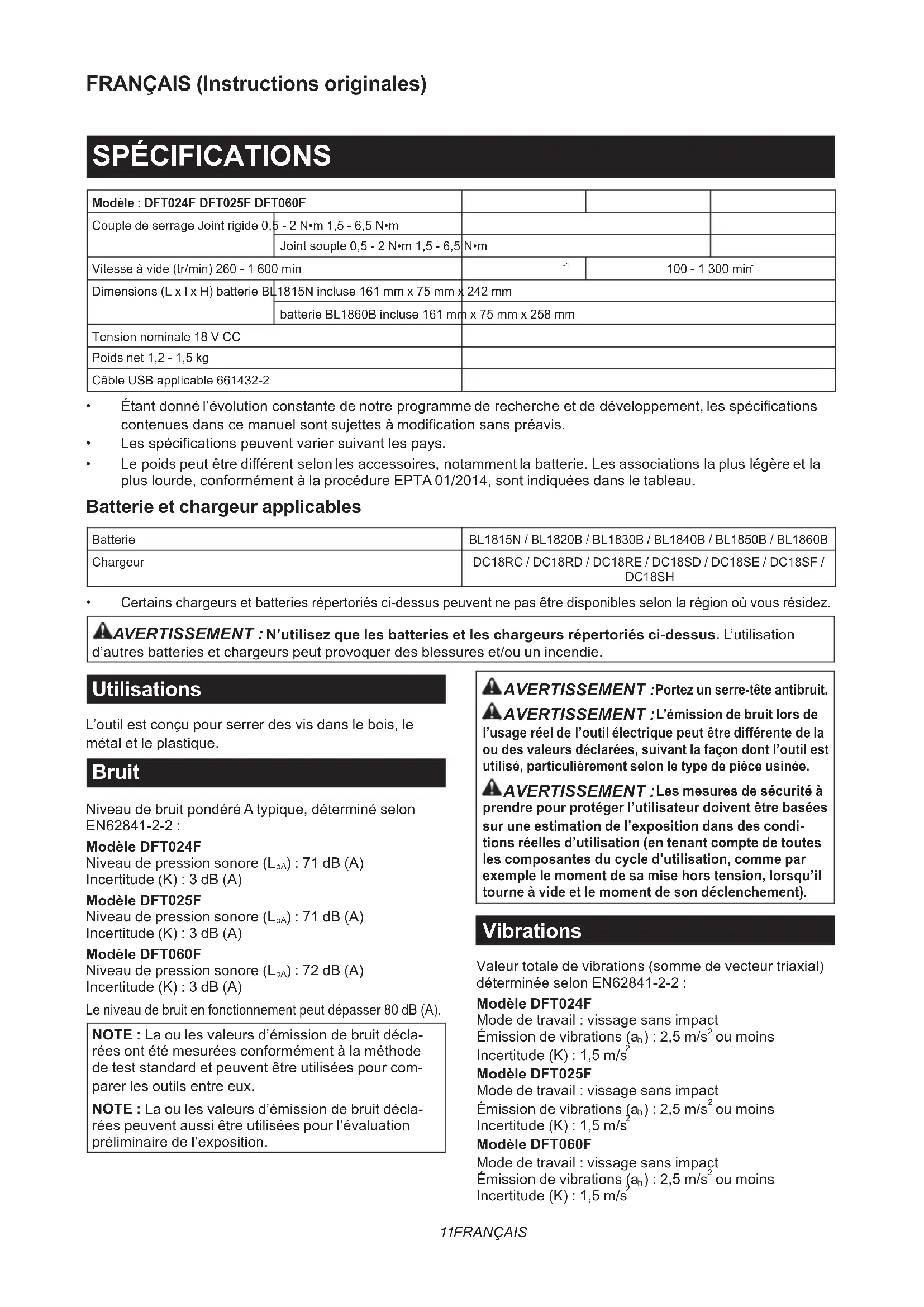 d’autres batteries et chargeurs peut provoquer des blessures et/ou un incendie. Utilisations L’outil est conçu pour serrer des vis dans le bois, le métal et le plastique. Bruit Niveau de bruit pondéré A typique, déterminé selon EN62841-2-2 : Modèle DFT024F Niveau de pression sonore (L